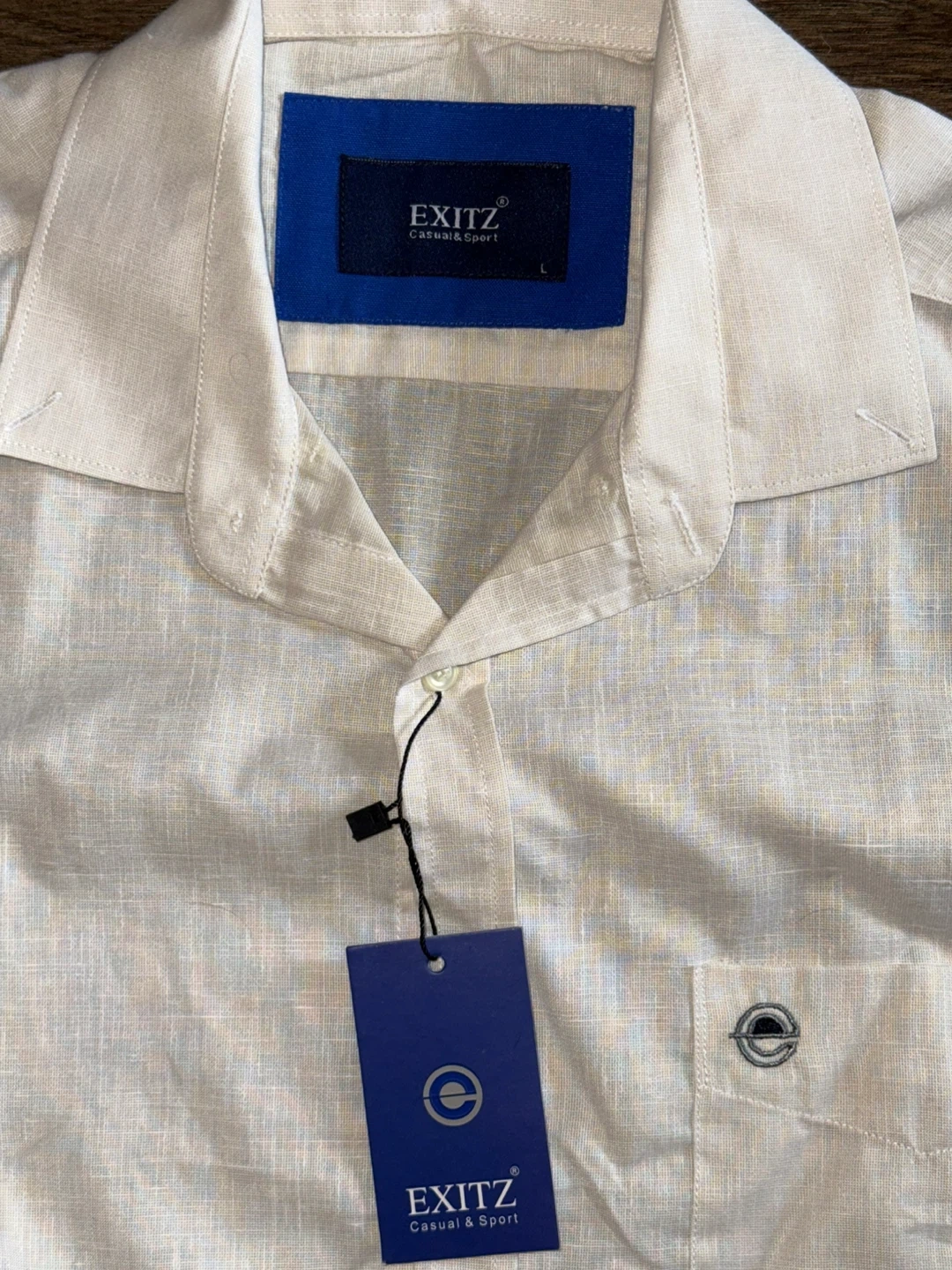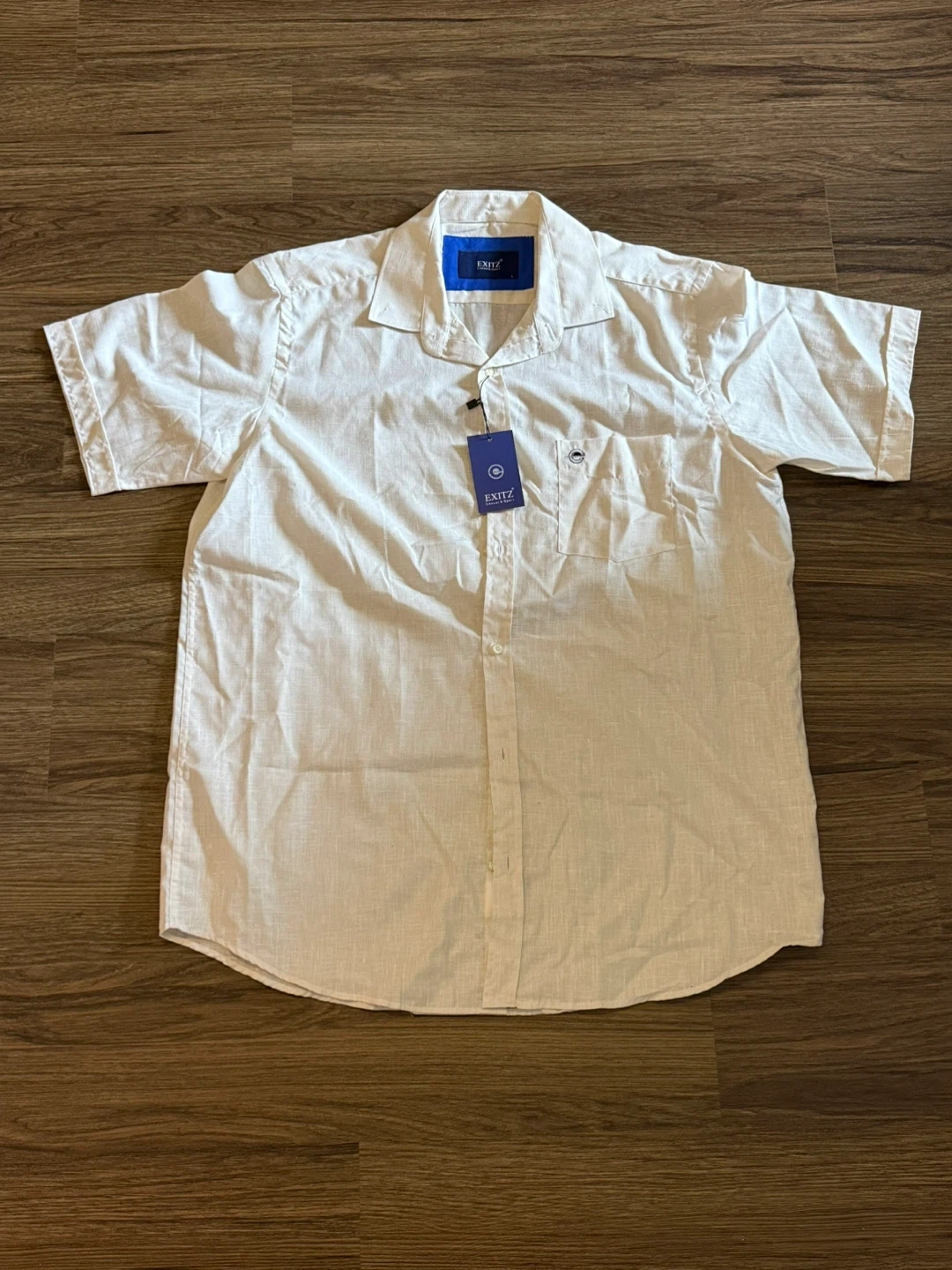 This New EXITZ short sleeve shirt is a size Large. It's a crisp white colour, perfect for casual wear. Made with a breathable fabric blend.