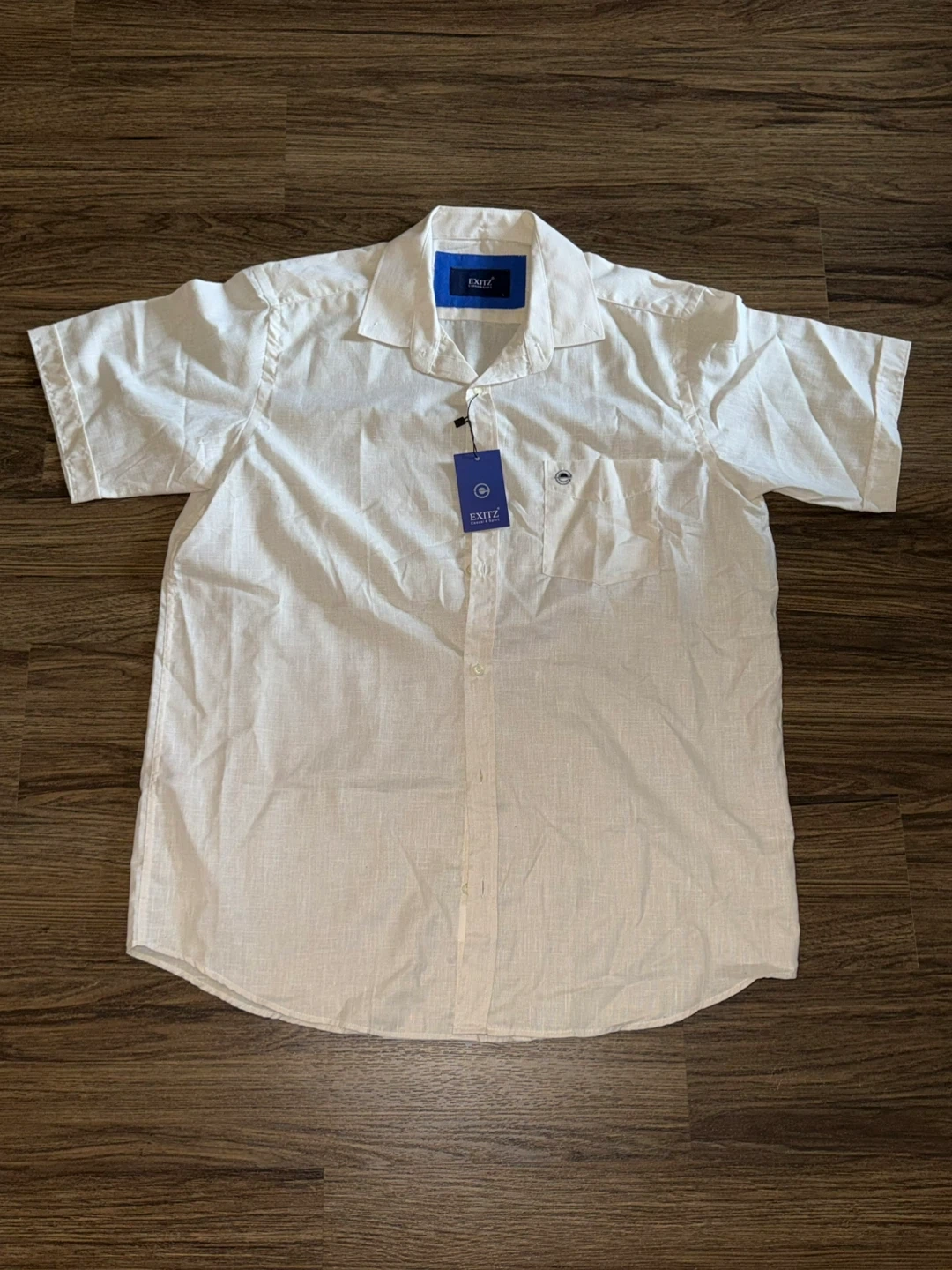 This New EXITZ short sleeve shirt is a size Large. It's a crisp white colour, perfect for casual wear. Made with a breathable fabric blend.
