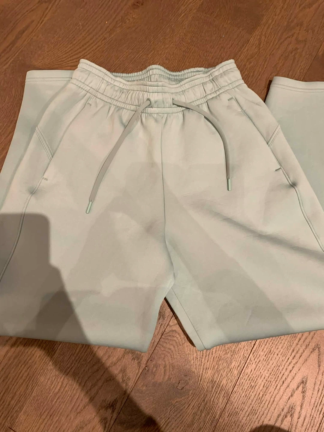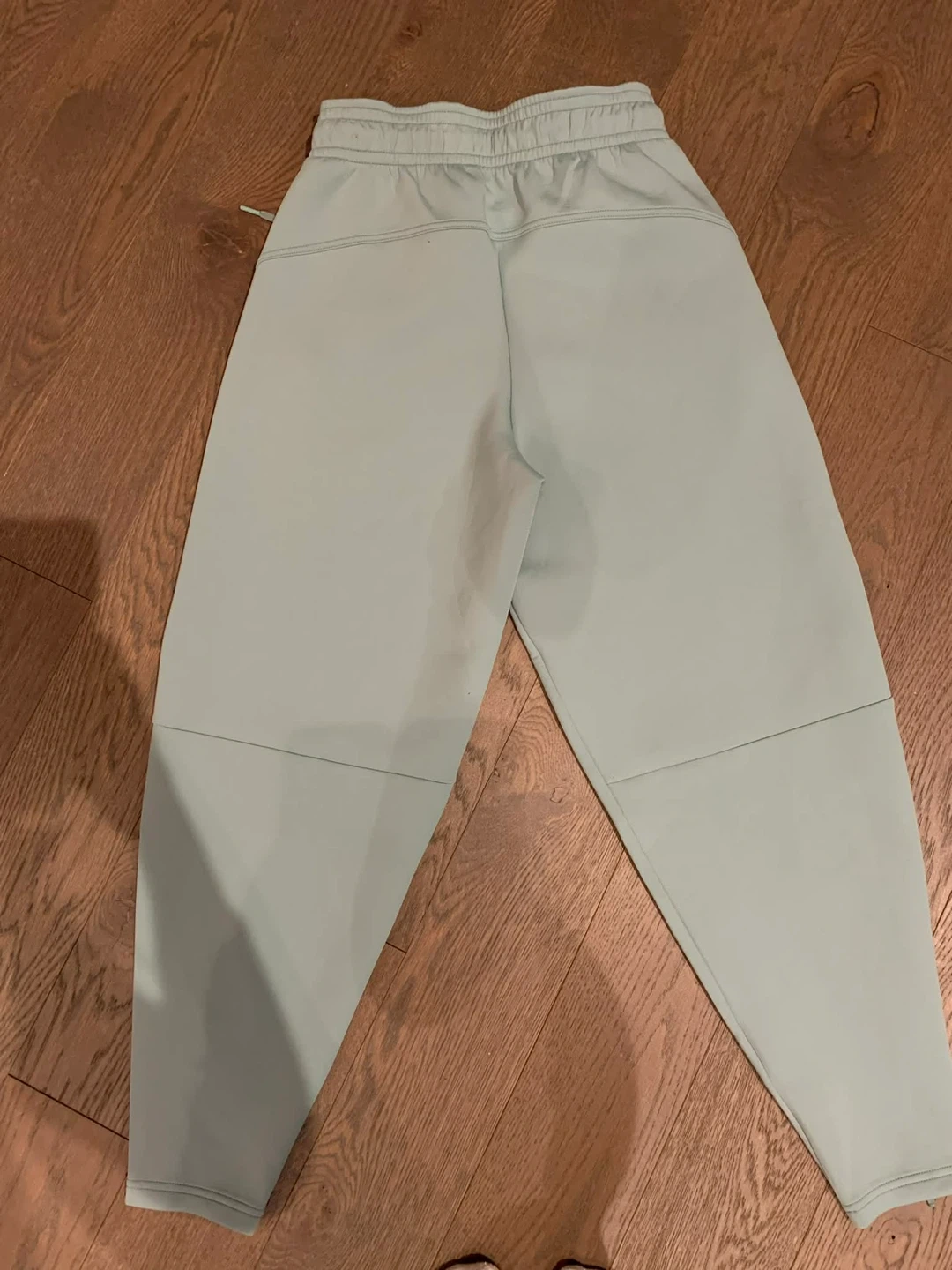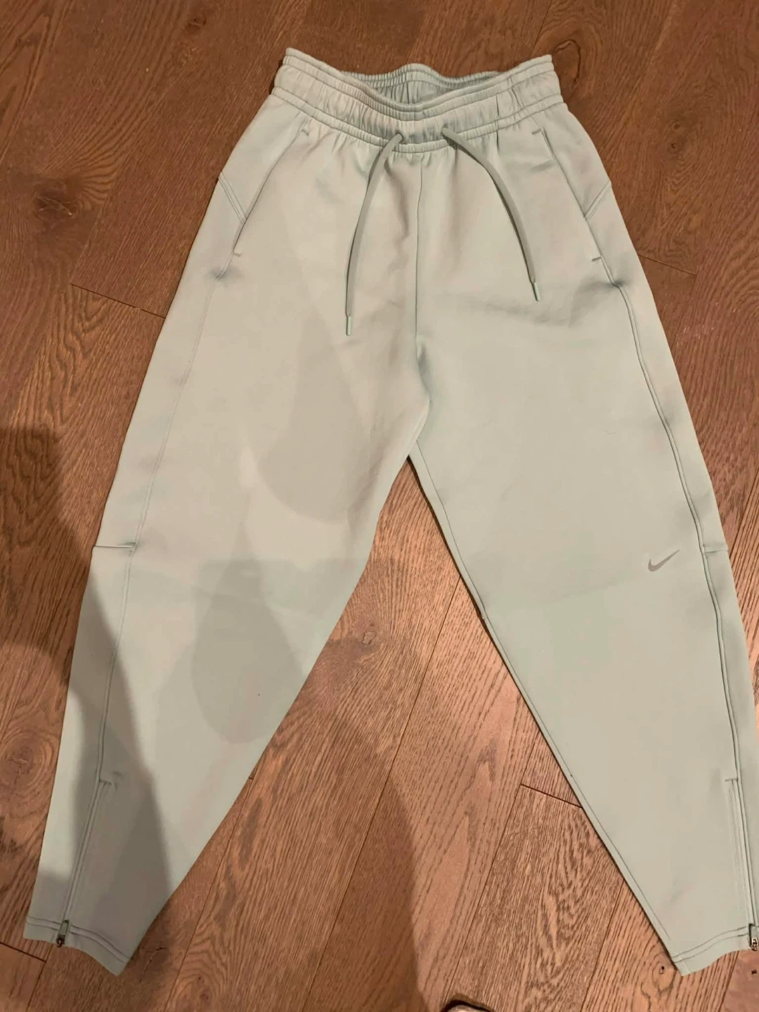 Selling a pair of Nike women's grey sweatpants. These pants have an elastic waistband with a drawstring for a comfortable fit. Features zippered ankles for adjustable styling. Made from a soft, comfortable fabric perfect for everyday wear or athletic activities.