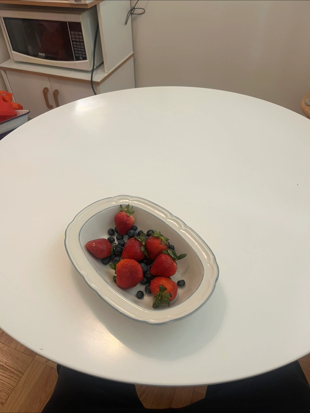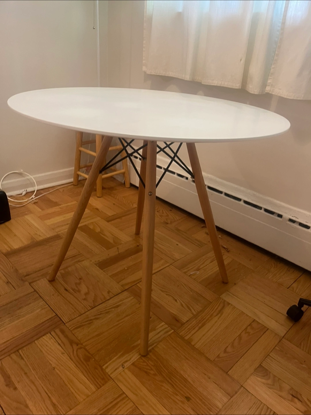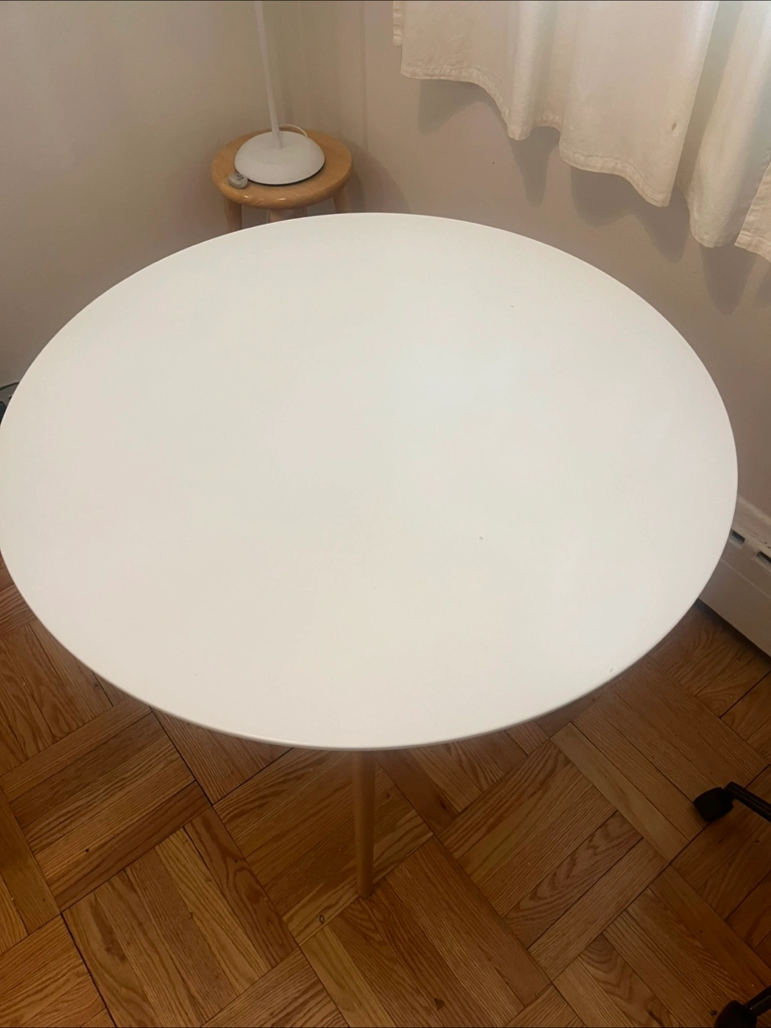 White round table with light wood legs. Modern minimalist design. Good condition. Washed and sanitized.