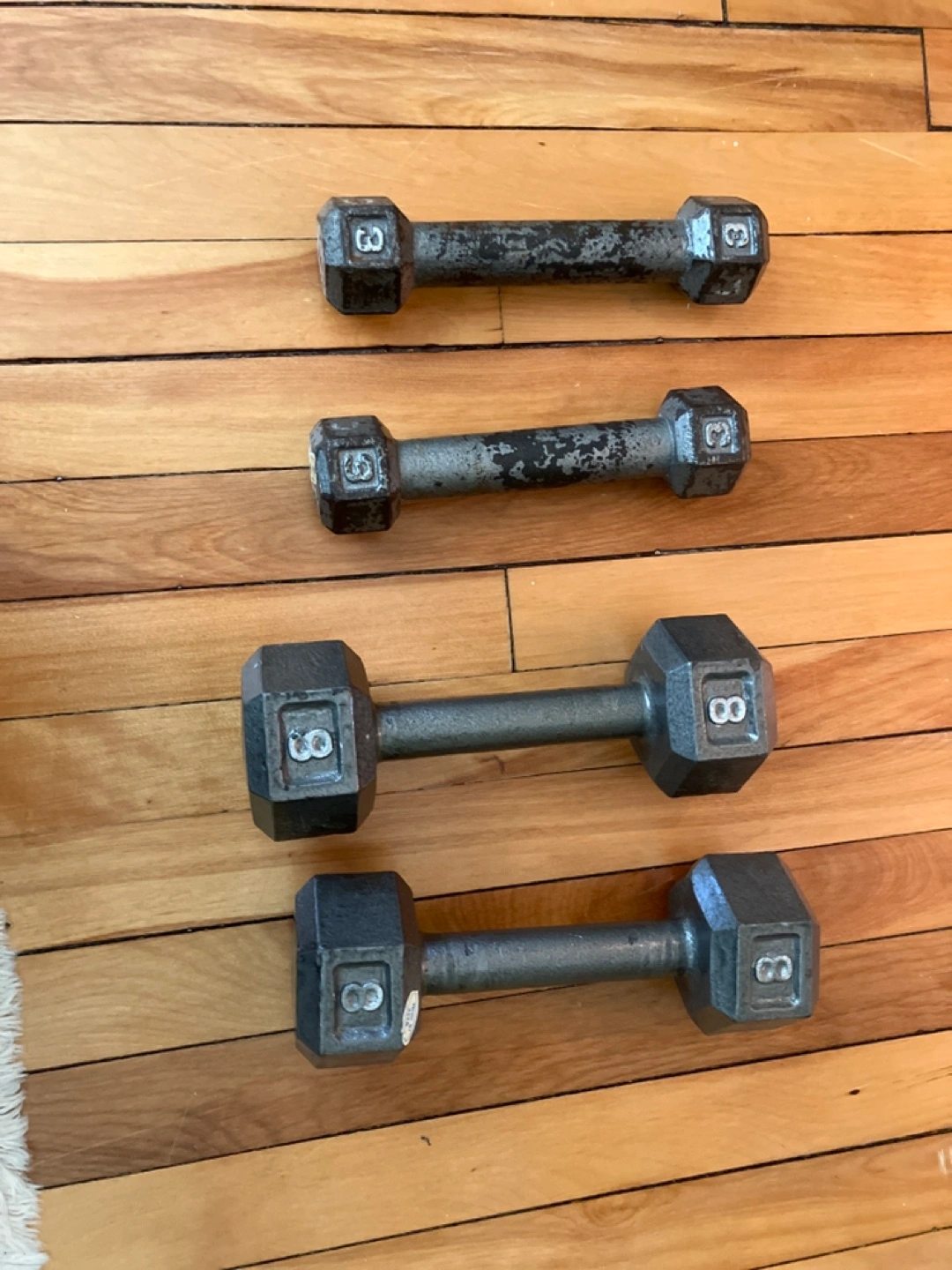 Four used hexagonal shaped dumbbell weights. Two pairs, one 3lb and one 8lb. Signs of wear on 3 lb. weights, 8 lb. weights in good condition.