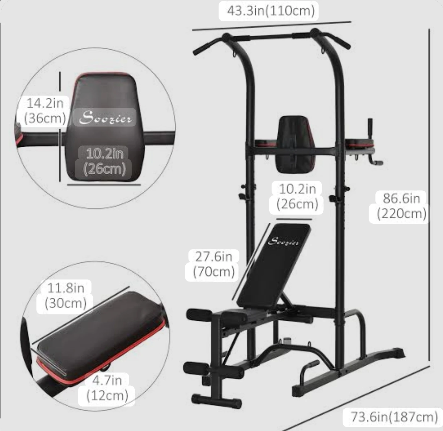 This Soozier workout station comes with a bench, pull up bar, dips and leg lift station.