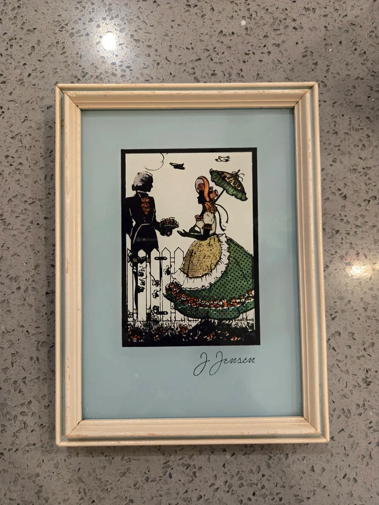 Here's a framed print signed by J. Jensen. It features a charming silhouette of a couple in period clothing. The frame is a light colour, and the print has a soft blue background. It's a lovely piece to add a touch of vintage charm to your home