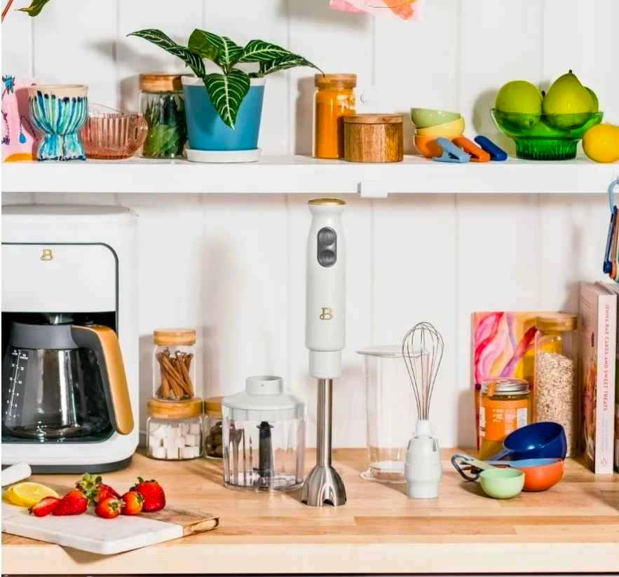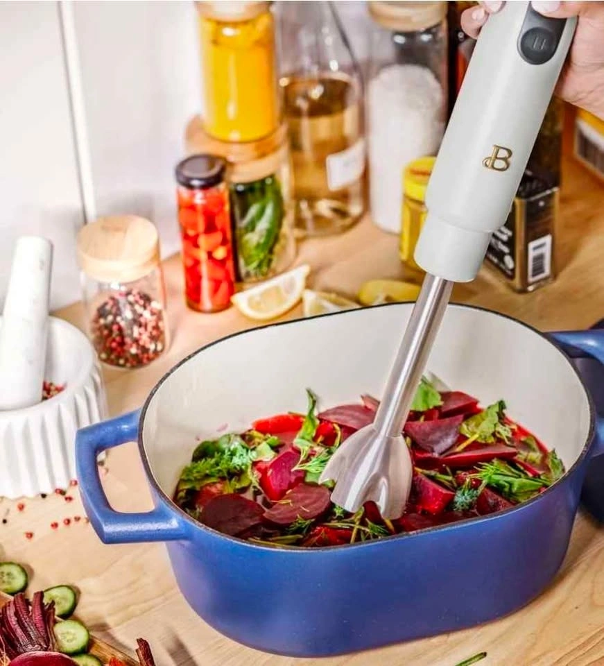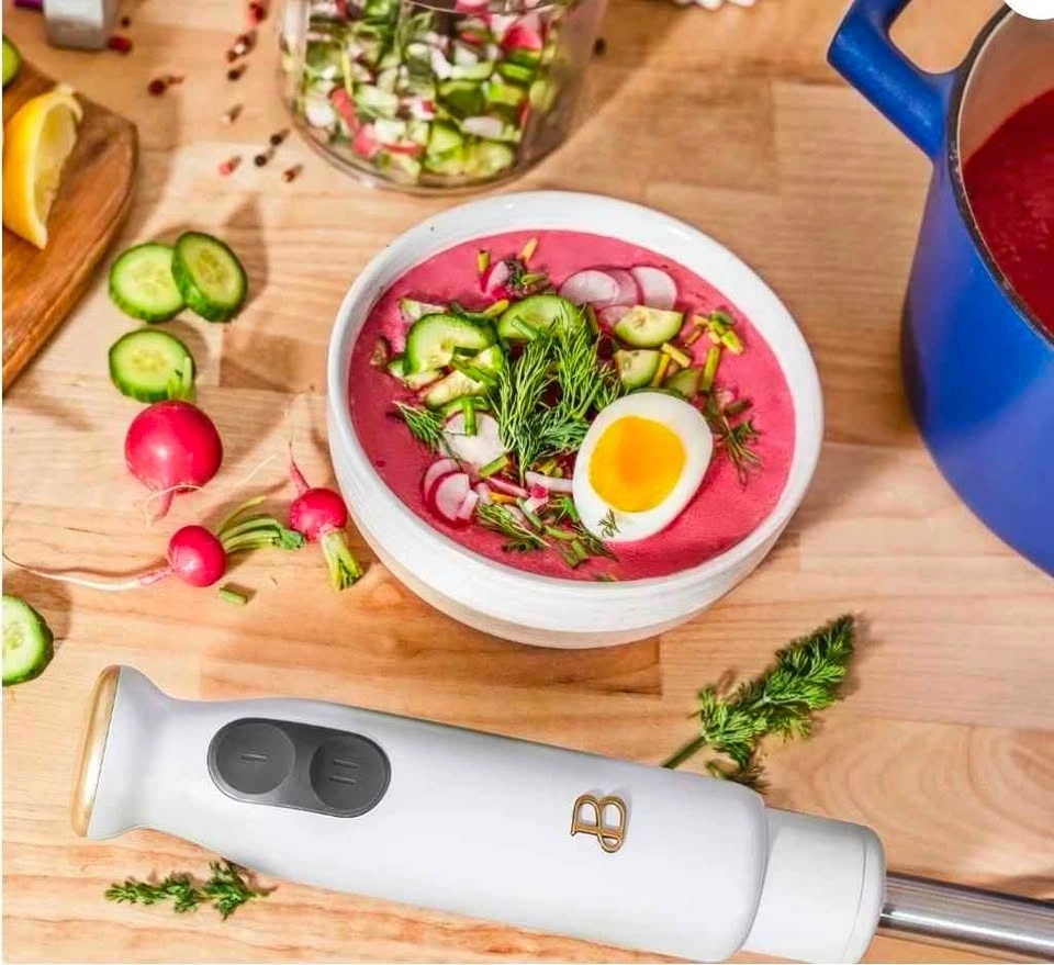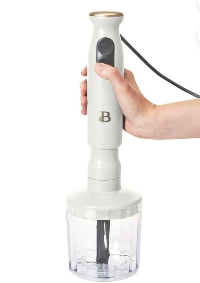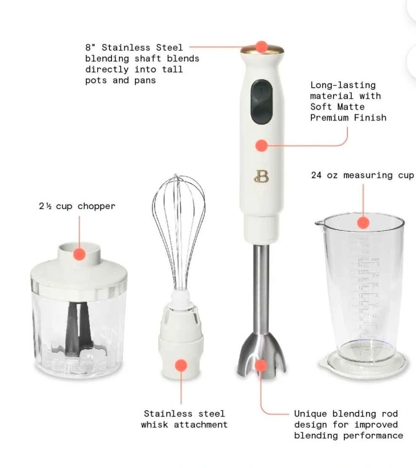 Powerful blending with a 400-watt DC motor, offering two speed settings (Low and High). Includes a 2-cup chopper, stainless steel whisk attachment, and a 24 oz measuring cup. Features an 8-inch stainless steel blending shaft and a soft matte premium coating. Designed with an ergonomic and lightweight body for comfortable handling. The detachable blending shaft locks easily and is dishwasher-safe for convenient cleaning. Includes an extra-long 5-foot cord.