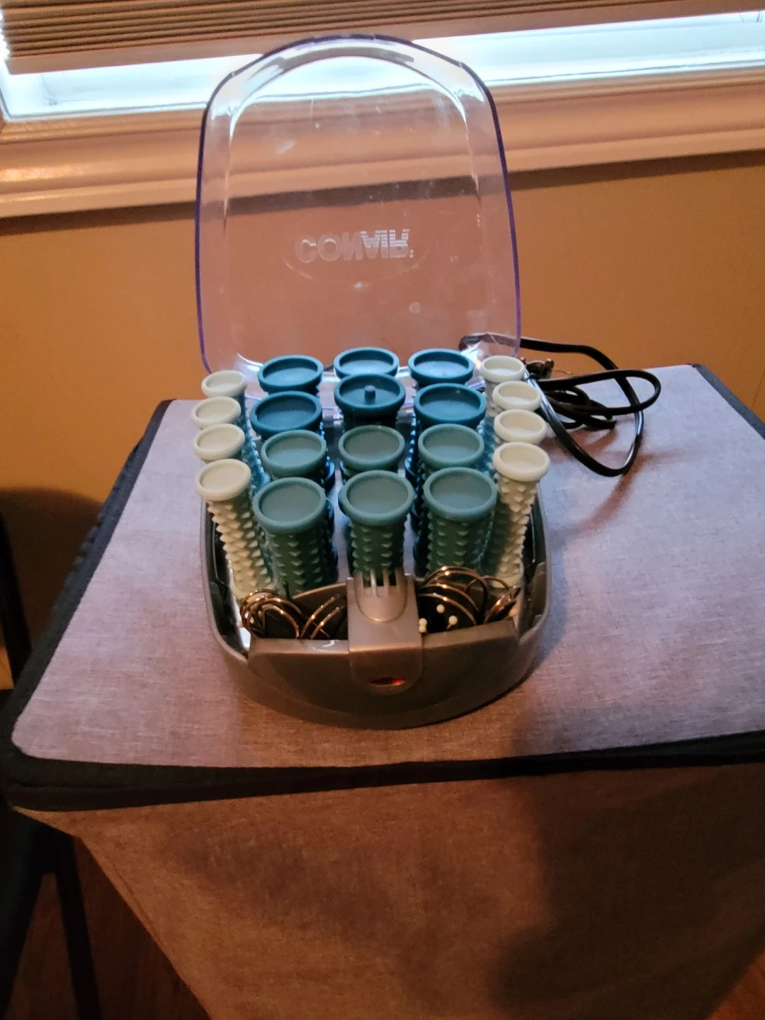 This Conair set includes a portable hair setter with multiple rollers for styling. It comes with various sizes of rollers and clips to help you achieve your desired look. Great for creating curls and volume! One hour clip missing.