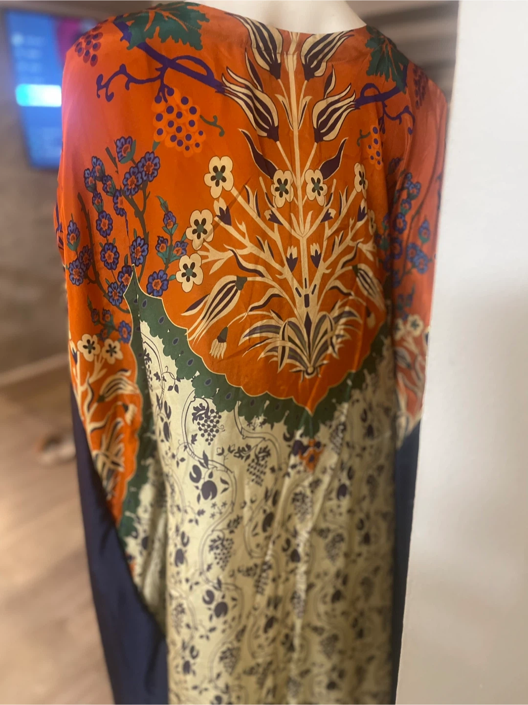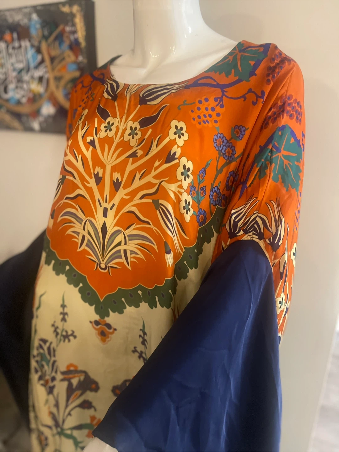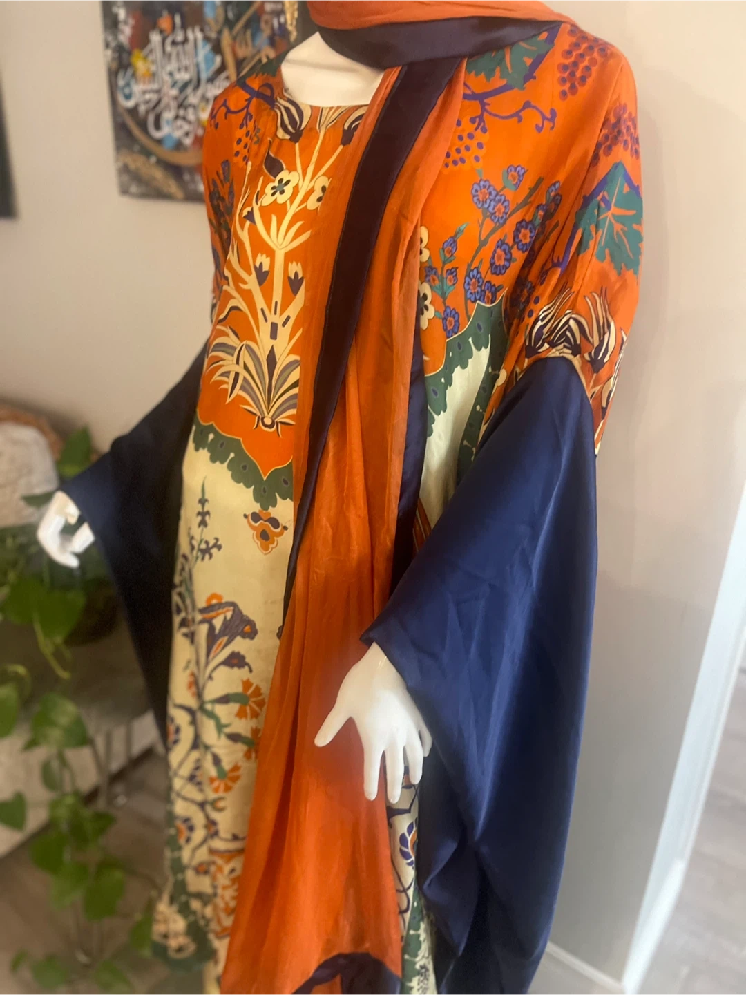 Orange Floral Print silk Kaftan with Navy Sleeves