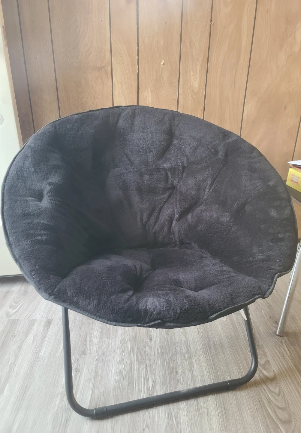 This is a black Moon Chair made with polyester fabric. It's a comfortable, saucer-shaped chair. It's great for relaxing in a bedroom or living area.