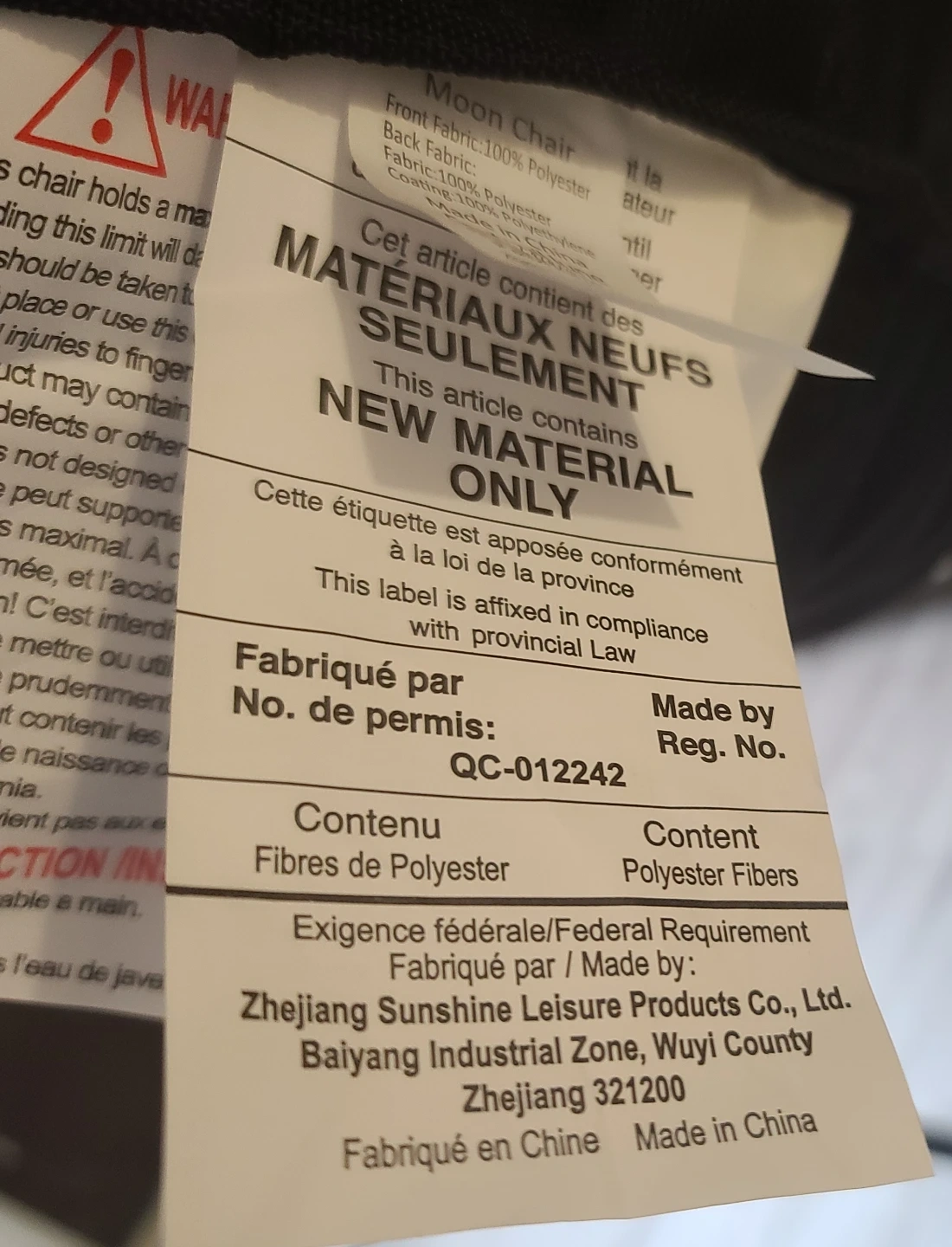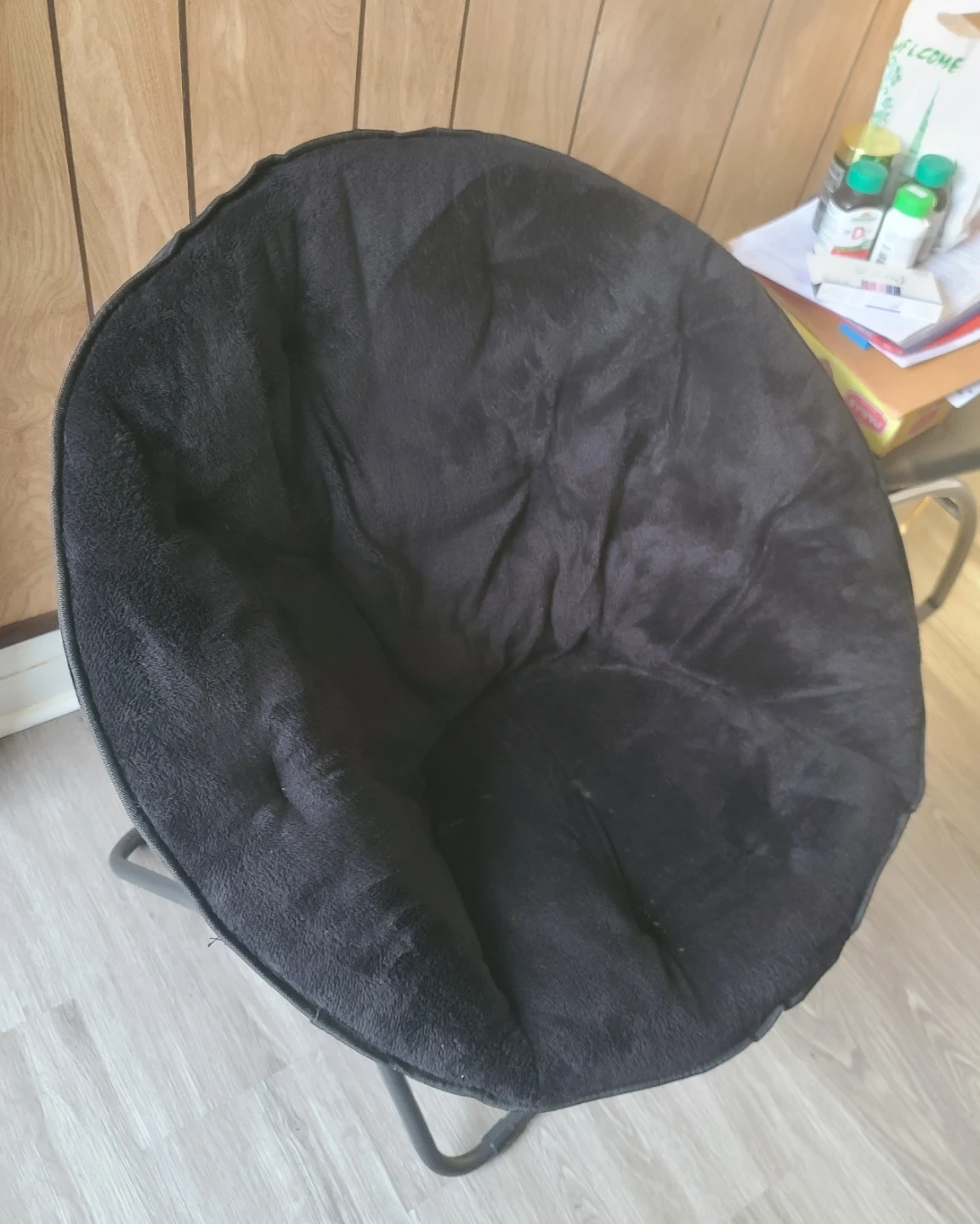 This is a black Moon Chair made with polyester fabric. It's a comfortable, saucer-shaped chair. It's great for relaxing in a bedroom or living area.