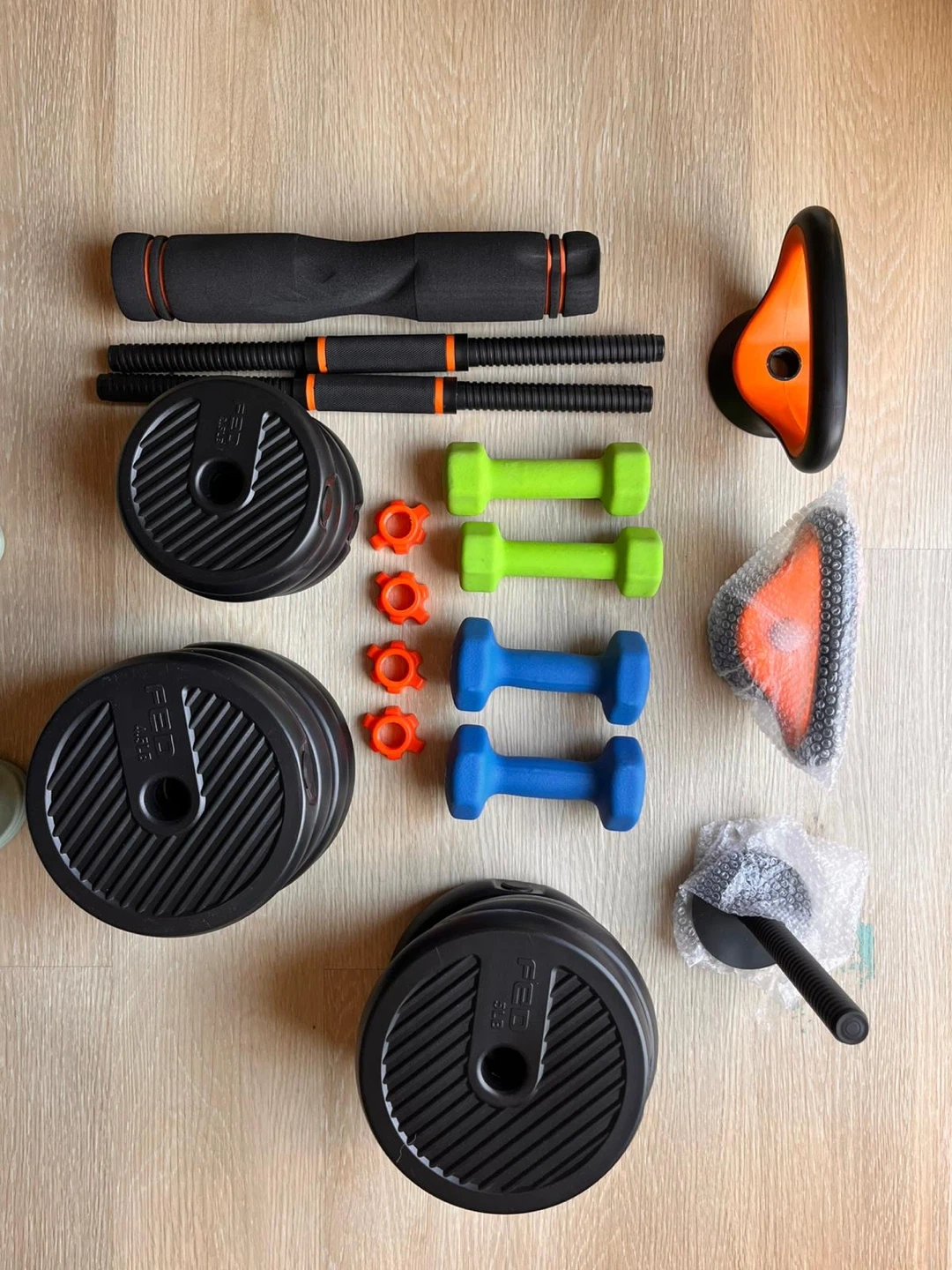 This dumbbell set includes adjustable weights (4 plates of 2.5 lb, 4 lb, and 5 lb), kettlebells, barbell for a versatile workout. Great for home gym use! Used only for a couple of months. The foam on the barbell has sunk a little, otherwise everything is as good as new. Available for $95.