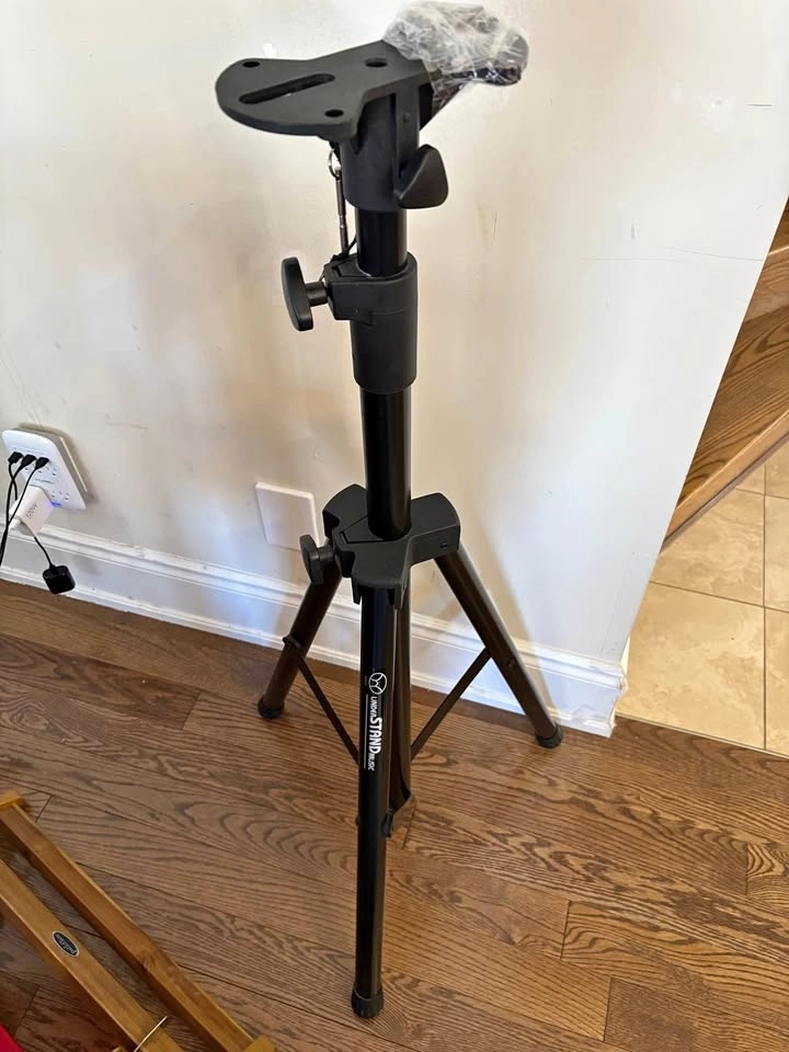 Strong and stable adjustable tripod stand. Great for speakers, projectors, equipment, or lighting. Features adjustable height, heavy duty metal construction, a stable tripod base, and is easy to transport. Good condition and works perfectly. Price: $35