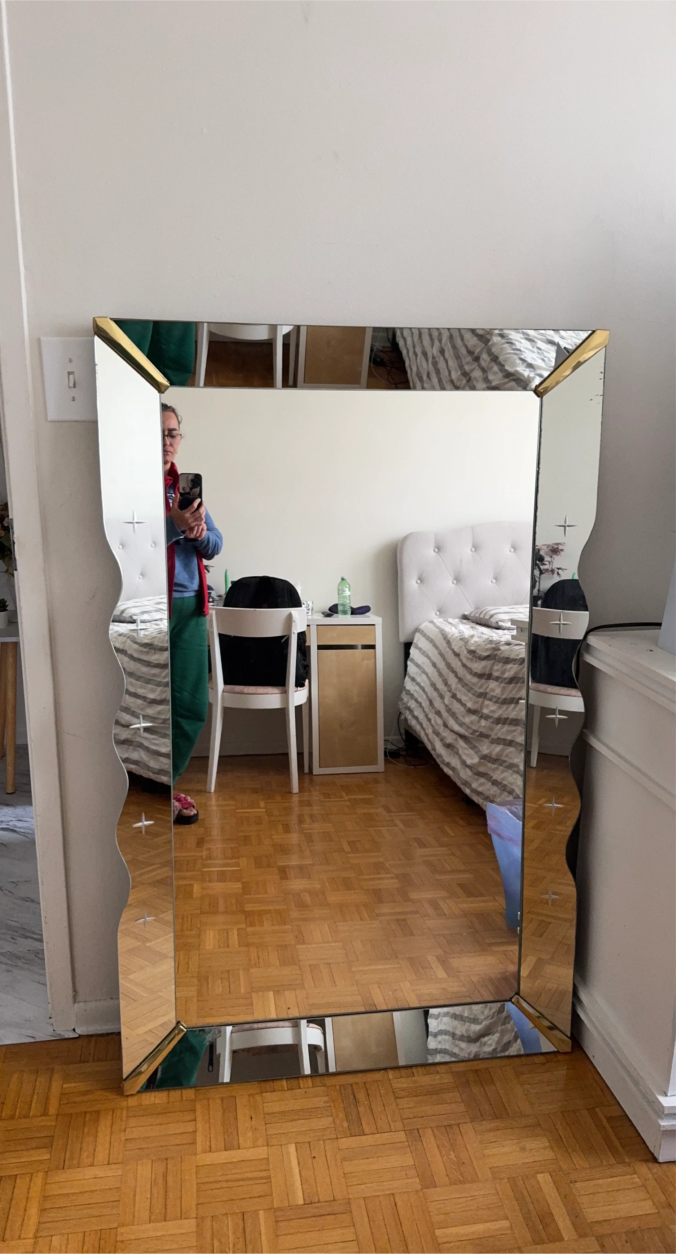 This is a large decorative mirror with a unique wavy edge and gold accents. It's perfect for a bedroom or living space. The mirror has a starburst design etched into the glass. Includes original mounting hardware.