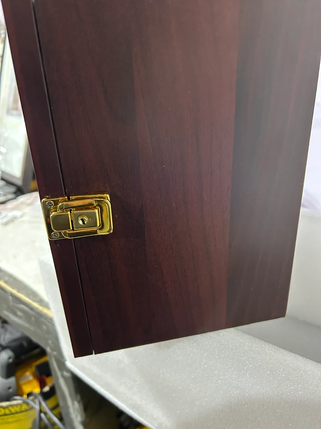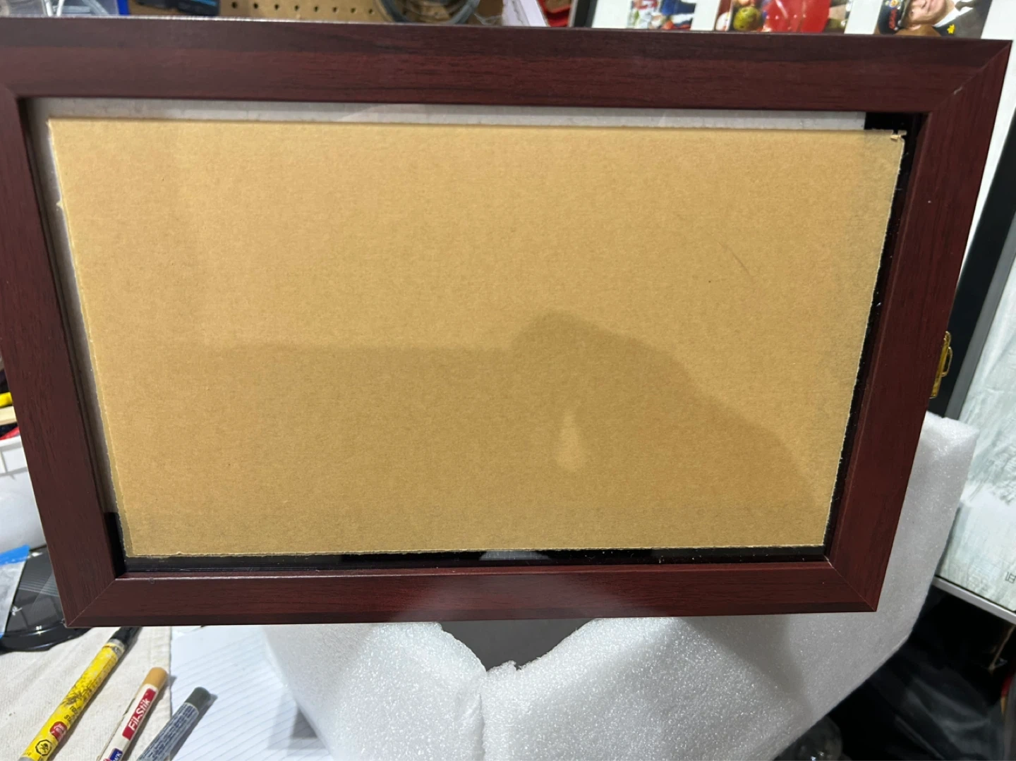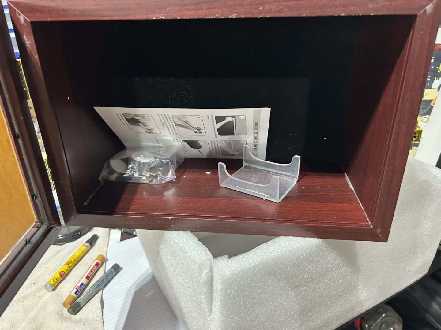 This is a display case for a football. It's made of dark wood with a gold latch. The interior is black with a small stand included. Instructions are also inside the case.