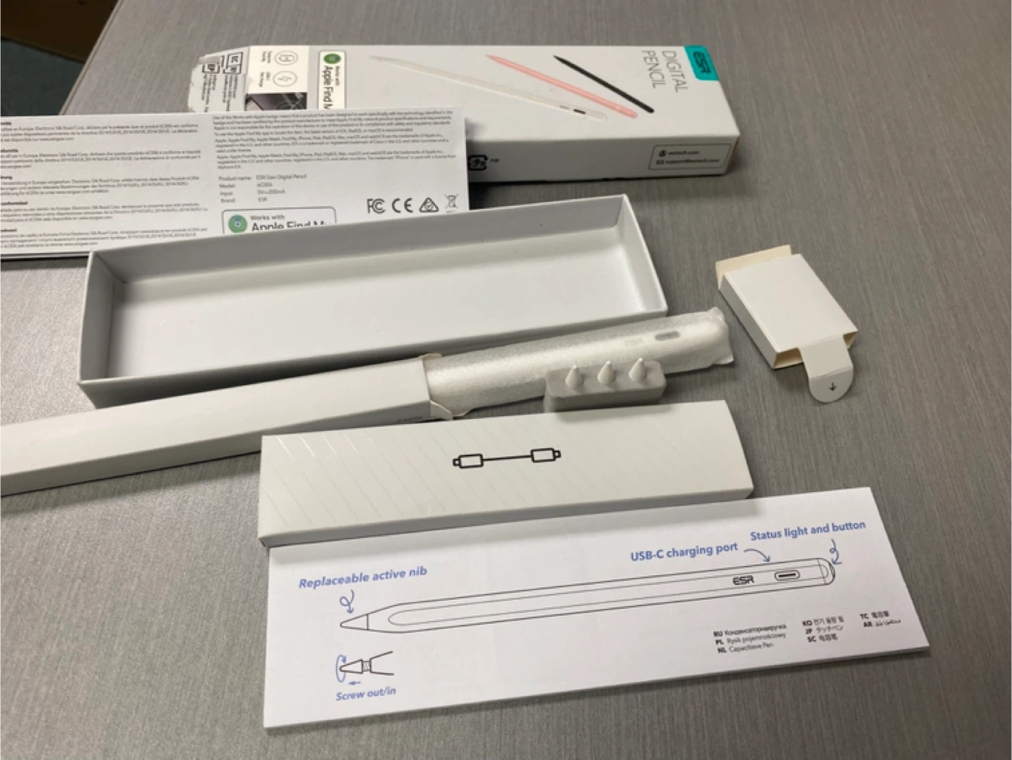 This ESR digital pencil works with Apple Find My and supports USB-C fast charging. It has a replaceable active nib and shortcut keys for smooth operation.