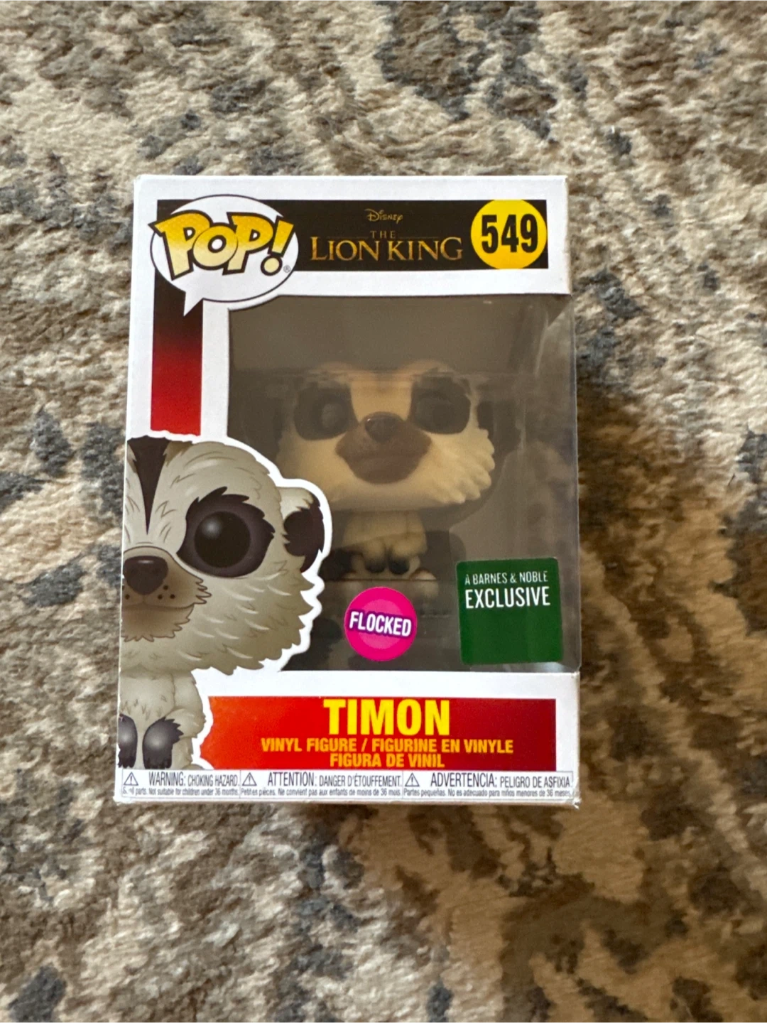 Selling a Funko Pop! of Timon from Disney's The Lion King, number 549. This is a Barnes & Noble exclusive and is flocked. The vinyl figure is in excellent condition and comes in its original box