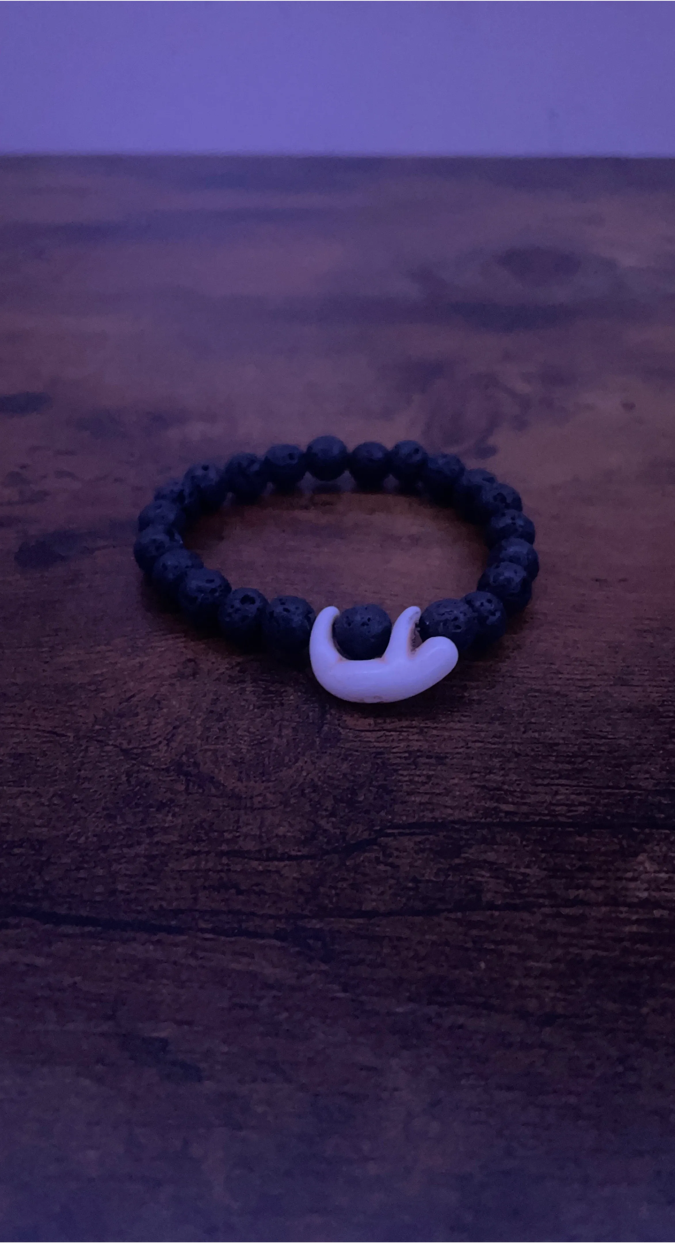 A black beaded bracelet featuring a white sloth charm. It's made with lava beads. This bracelet is a fun accessory for any sloth lover!