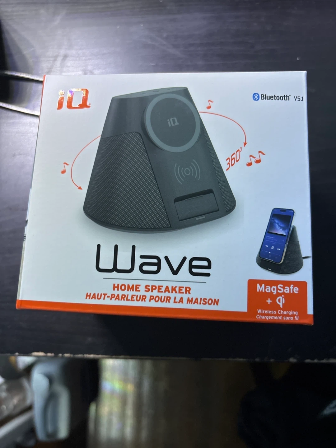 23Selling an iQ Wave Home Speaker didn’t open brand new - Bluetooth V5.1 - 15W Qi wireless charger with flip out stand - 7.5W MagSafe wireless charger for use with Apple or android - 10W Stereo Output (2x5W) - Bluetooth Range 10m Compatible with all smartphones, tablets, and laptops