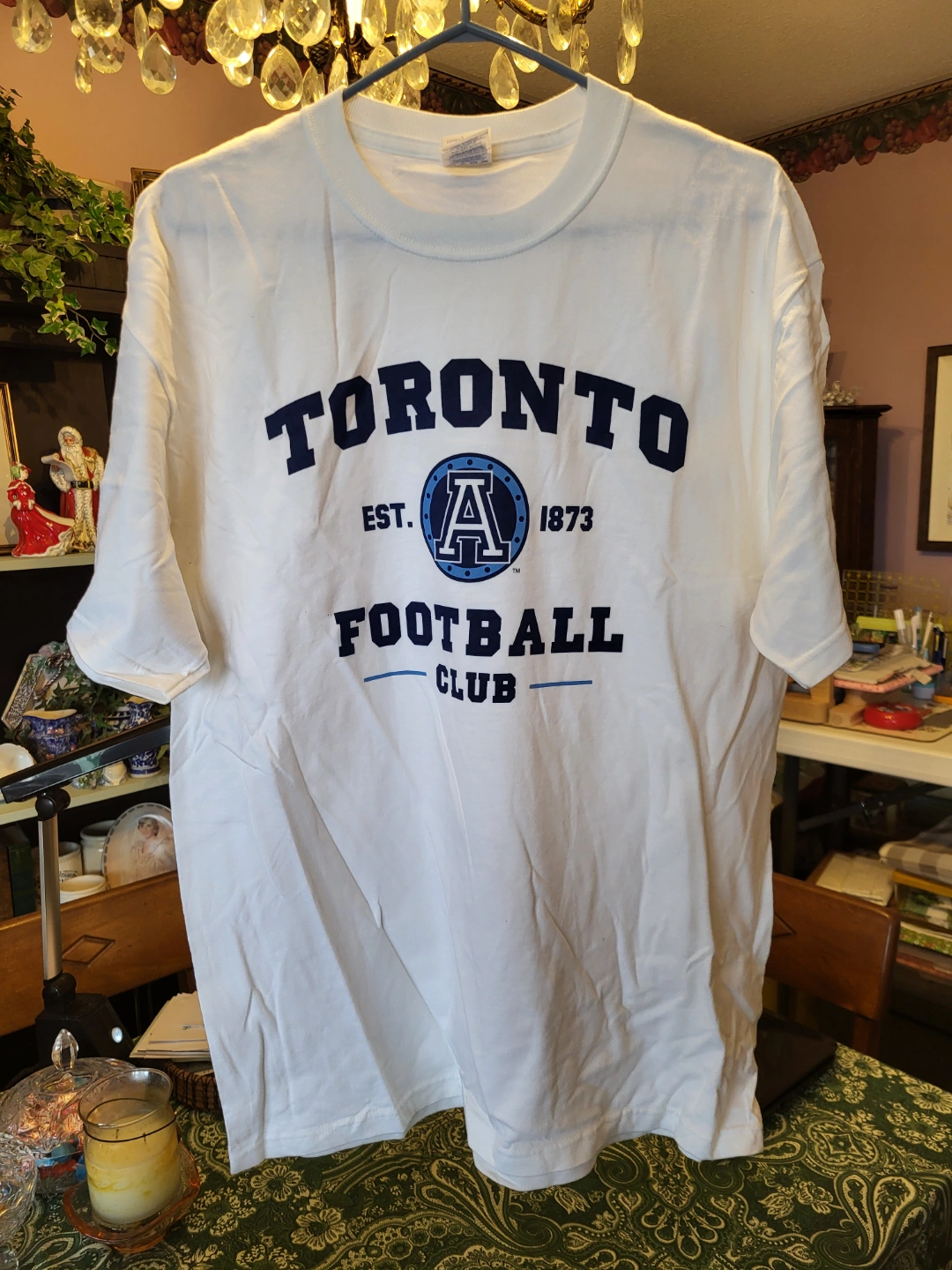 White cotton t-shirt. Features Toronto ARGO Football Club logo and text. Est. 1873. Brand New never worn. Smoke free home. Available sizes, Large, Ex Large. Sold individually.