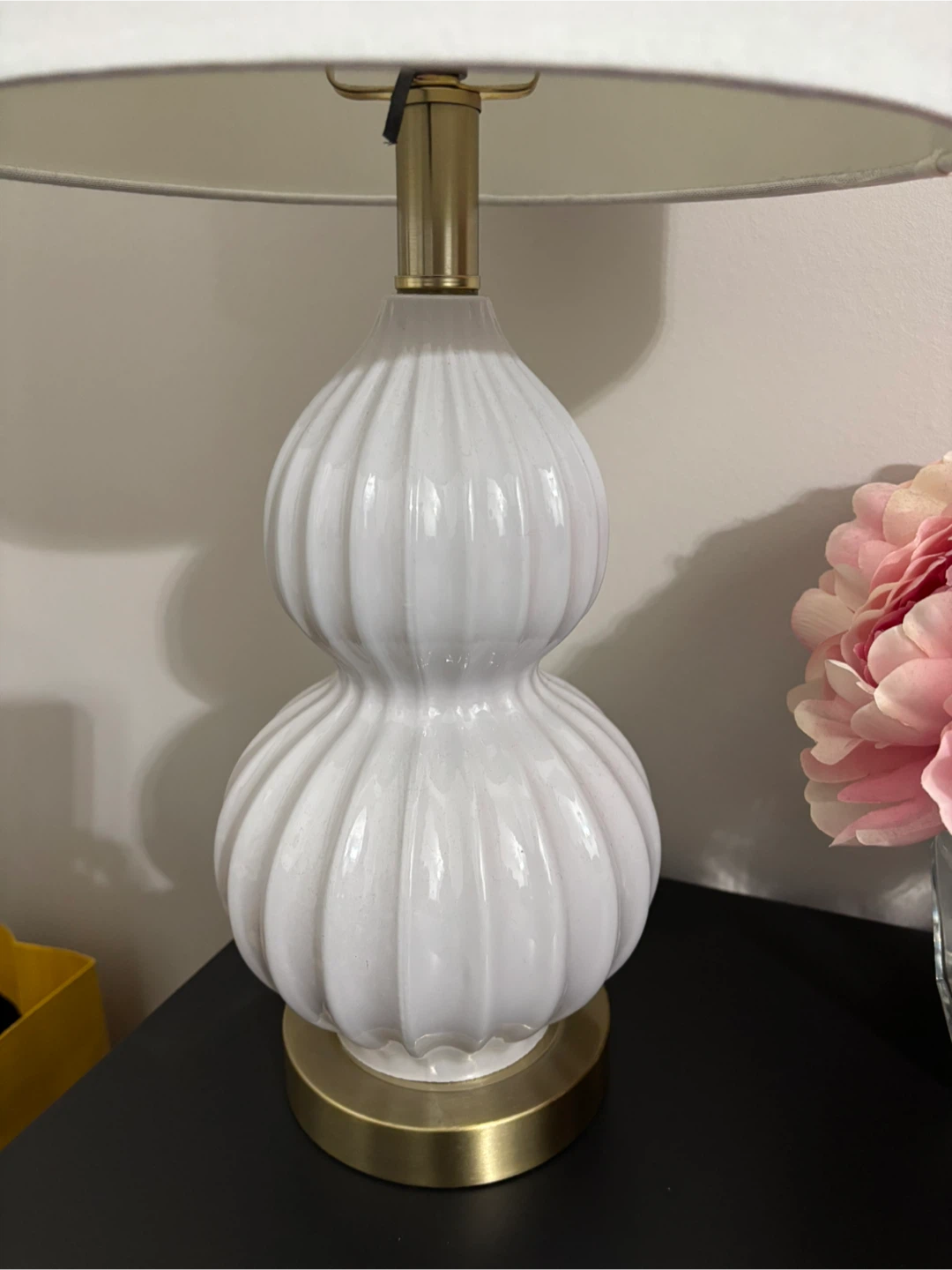 This stylish table lamp features a ribbed white ceramic base with a gold-toned accent. It comes with a white fabric lampshade. It's a great addition to any living room or bedroom!