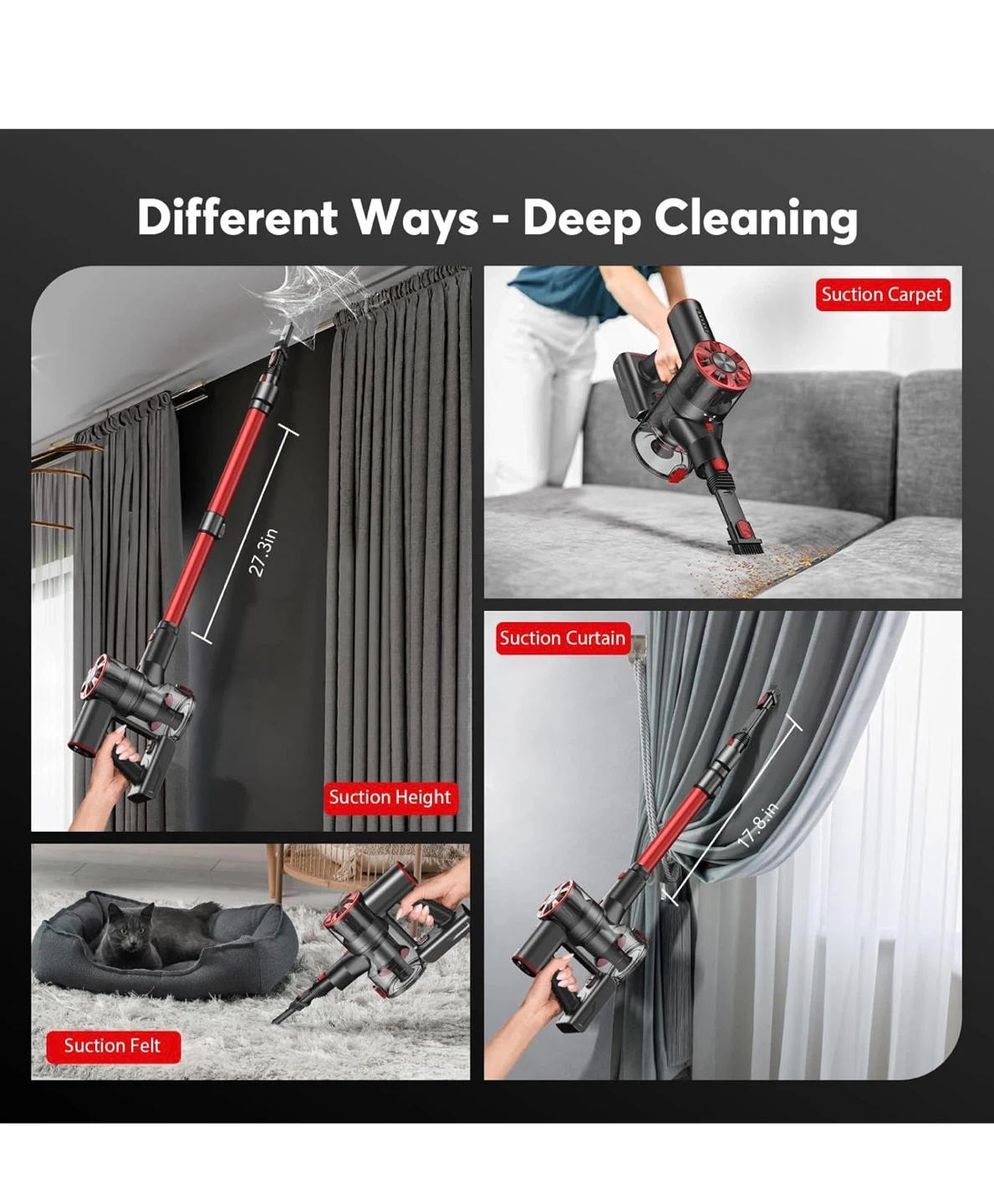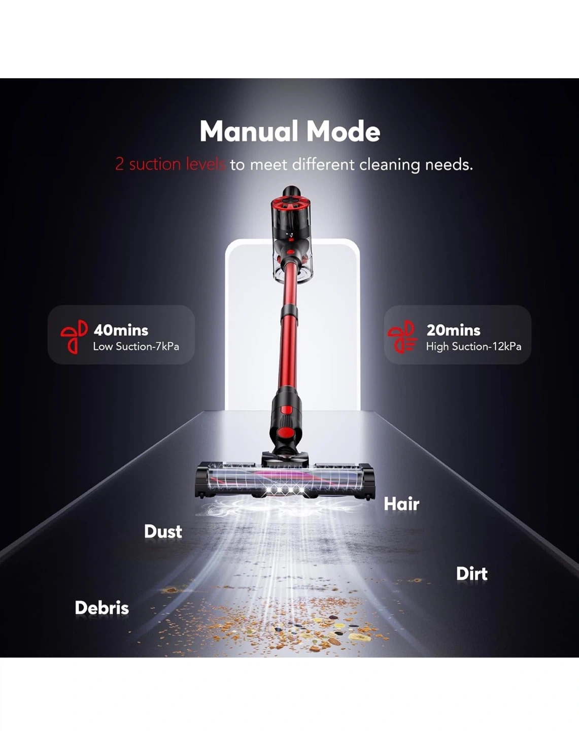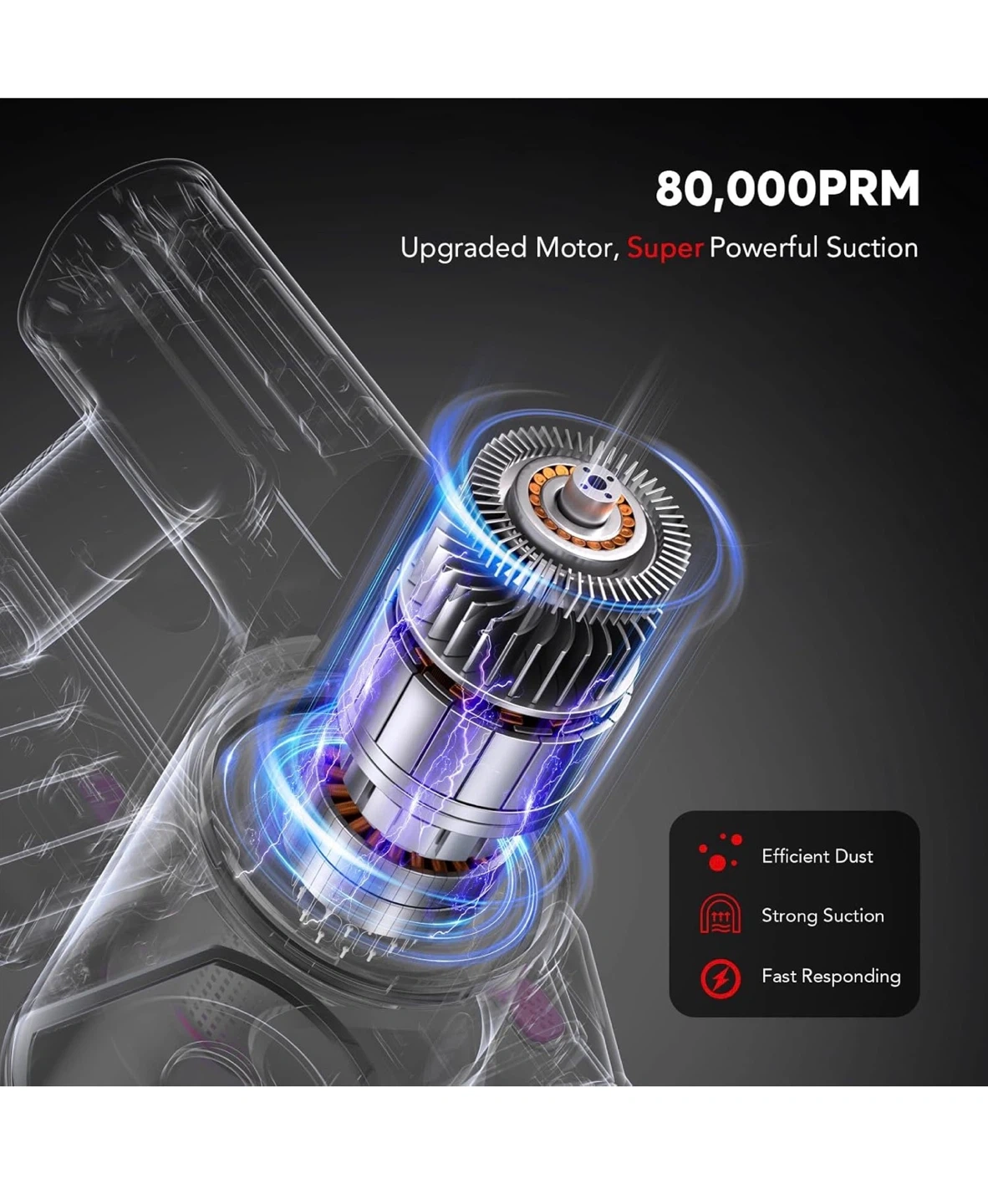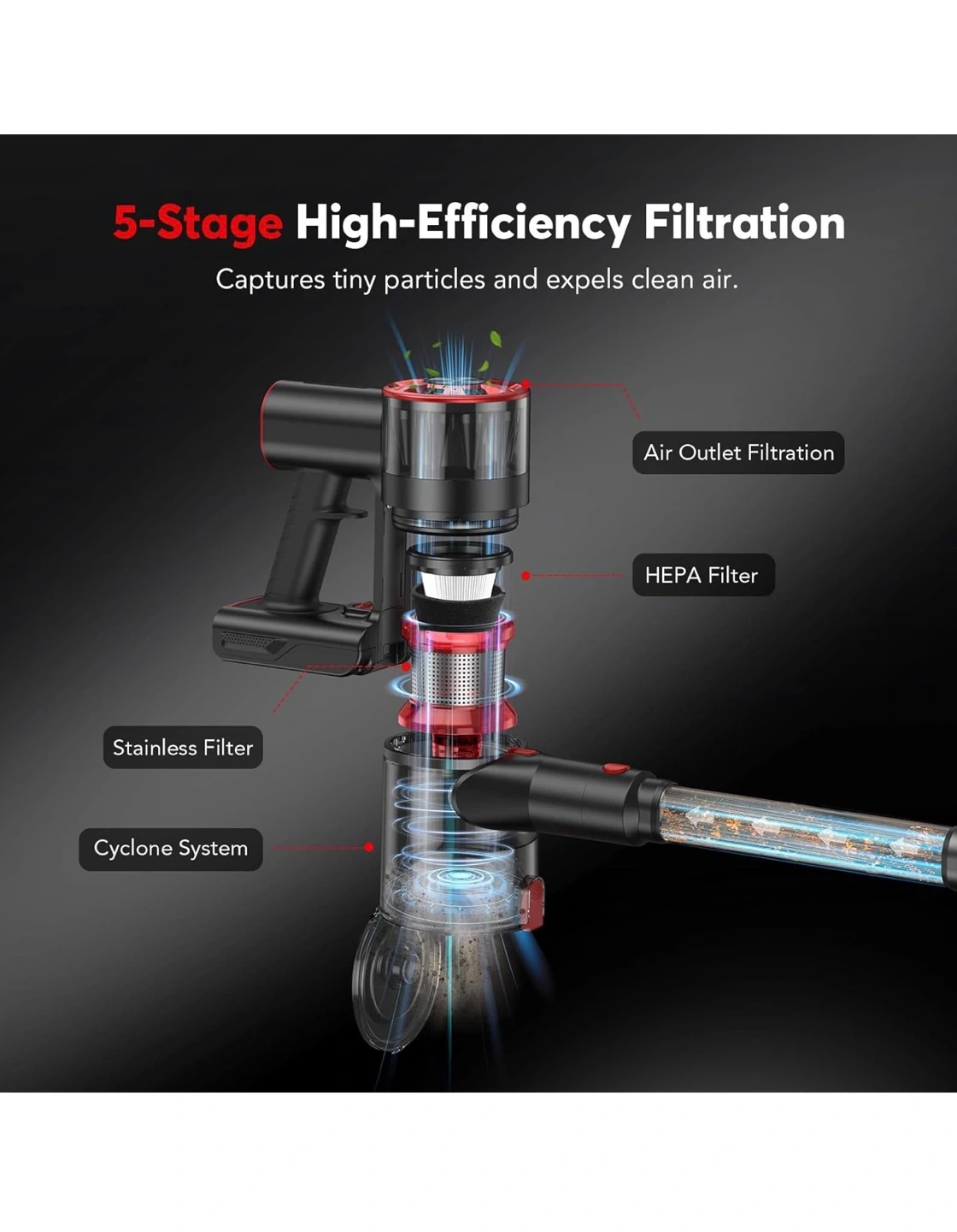 Cordless vacuum cleaner with 5-stage high-efficiency filtration. Includes HEPA filter, stainless filter, and cyclone system. 80,000 PRM upgraded motor offers super powerful suction. Manual mode with 2 suction levels for different cleaning needs.