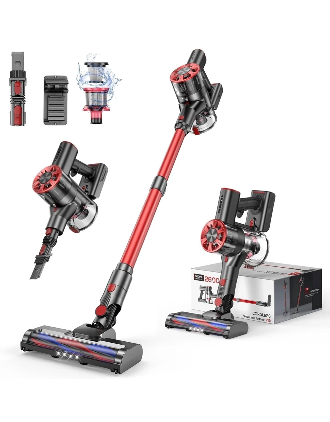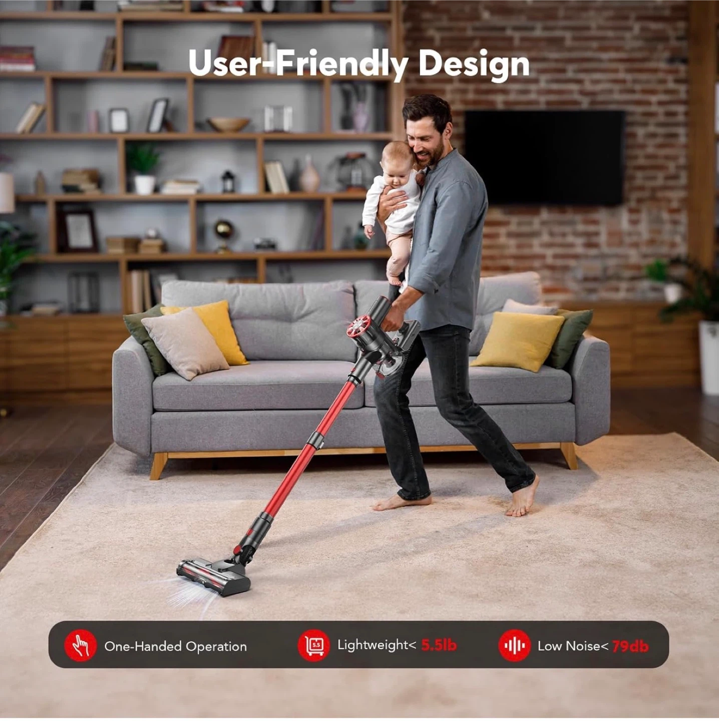 Cordless vacuum cleaner with 5-stage high-efficiency filtration. Includes HEPA filter, stainless filter, and cyclone system. 80,000 PRM upgraded motor offers super powerful suction. Manual mode with 2 suction levels for different cleaning needs.