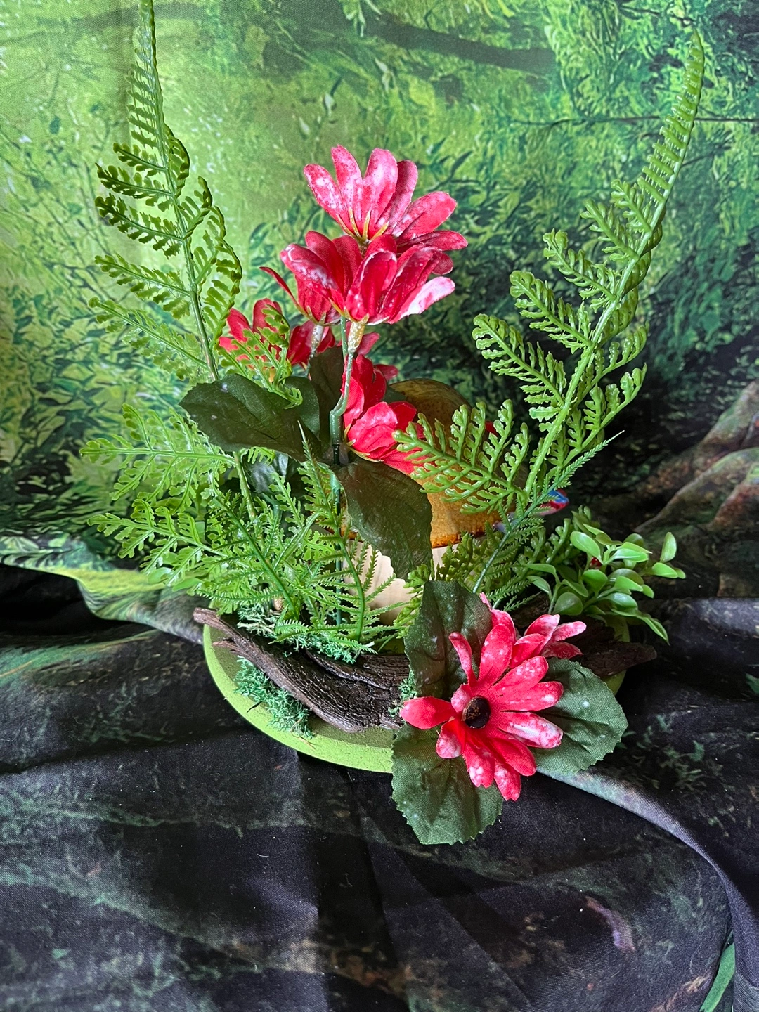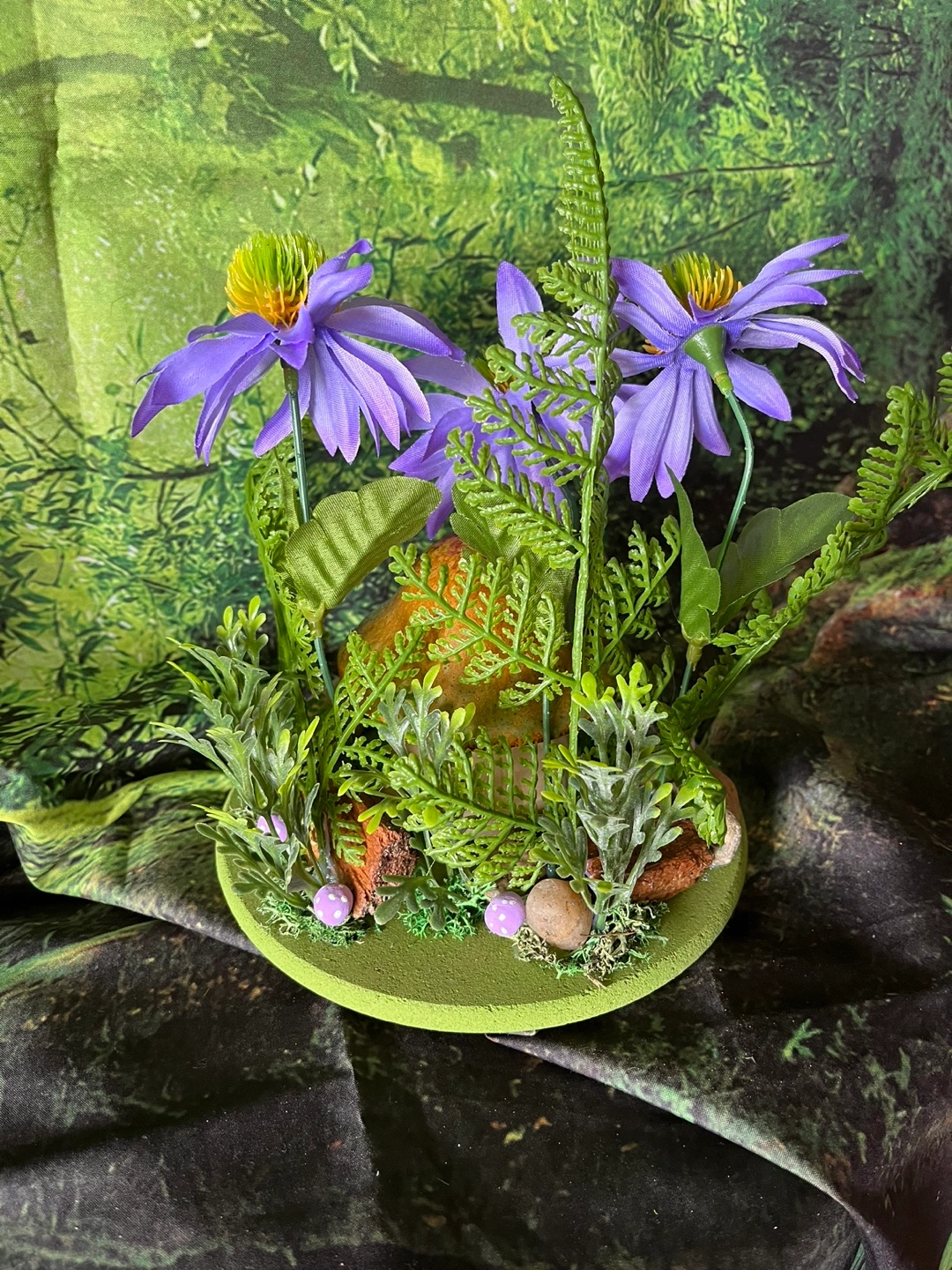 Charming miniature mushroom fairy house nestled in a whimsical landscape Features artificial flowers and greenery. Perfect whimsical garden accent or shelf décor. Handcrafted. One of a kind