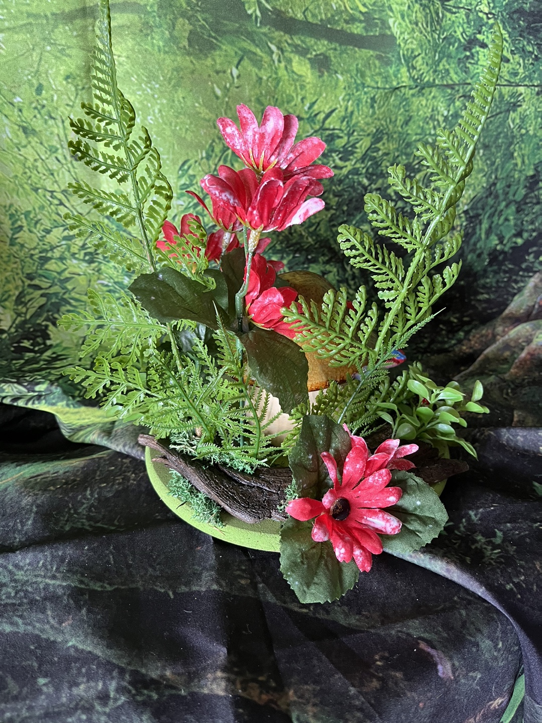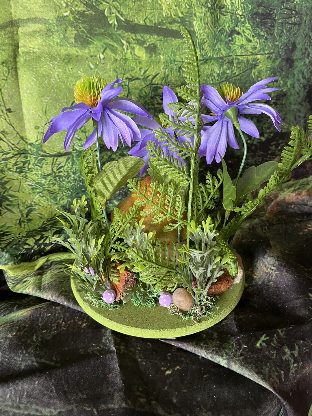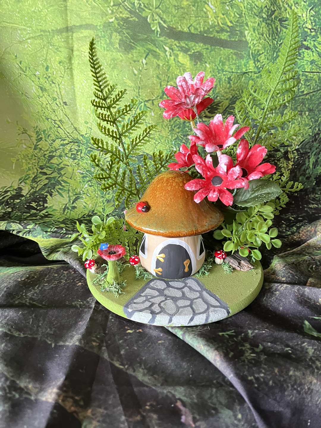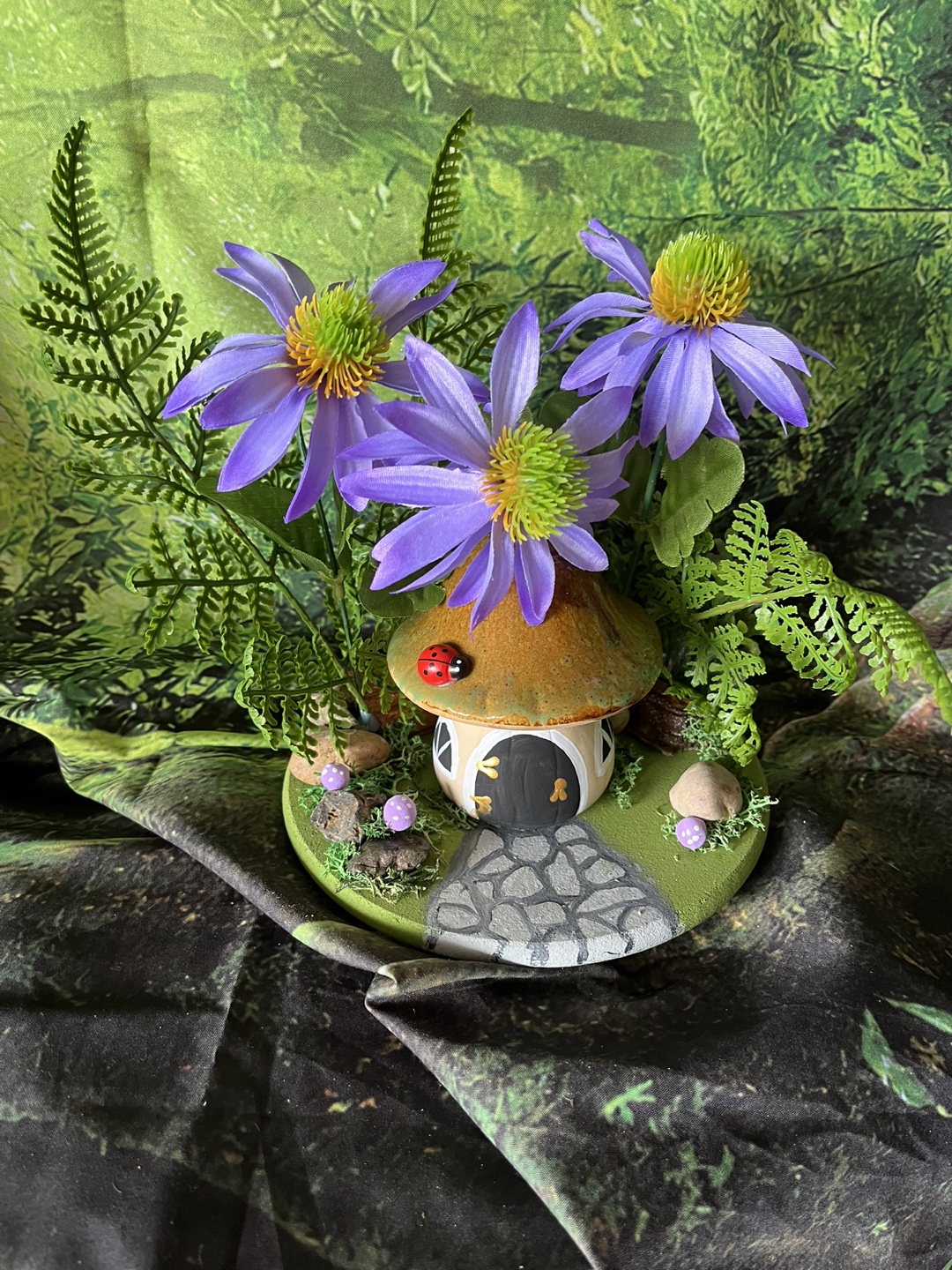 Charming miniature mushroom fairy house nestled in a whimsical landscape Features artificial flowers and greenery. Perfect whimsical garden accent or shelf décor. Handcrafted. One of a kind