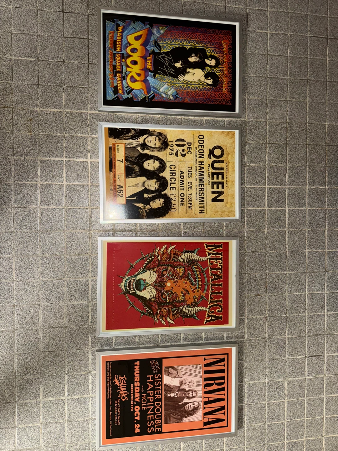 Four framed concert posters: The Doors at Madison Square Garden, Queen at Odeon Hammersmith in 1975, Metallica, and Nirvana with Sister Double Happiness. Posters feature band artwork and concert details. Framed dimensions are consistent across all posters.