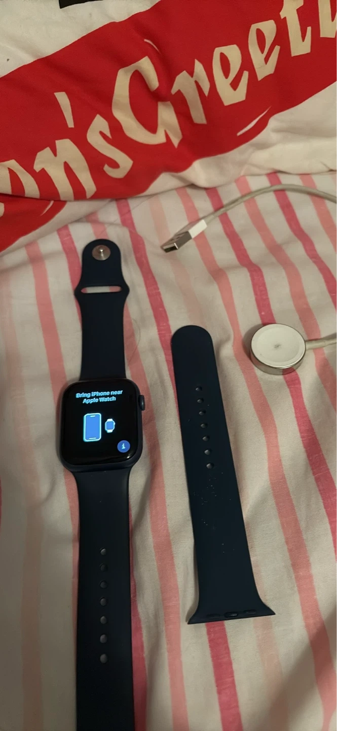 Apple Watch Series 7. It's the most durable Apple Watch yet, with a larger screen. Connects to iPhone for setup. The watch has a Midnight Aluminium Case and a Midnight Sport Band. 45mm size.
