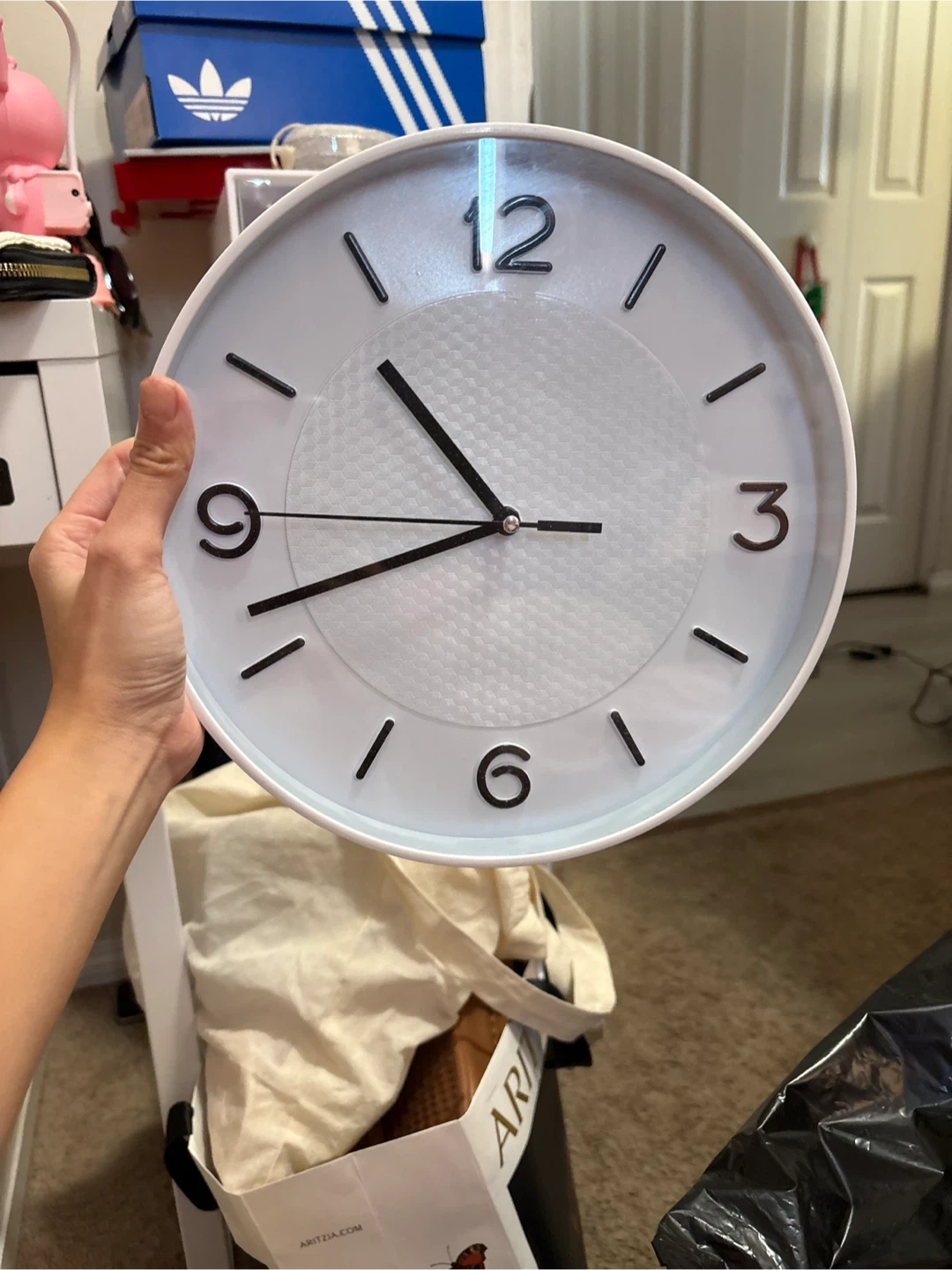 Selling a simple white wall clock! It has a clean, minimalist design with black numerals and hands. It's in great condition and would look lovely in any room