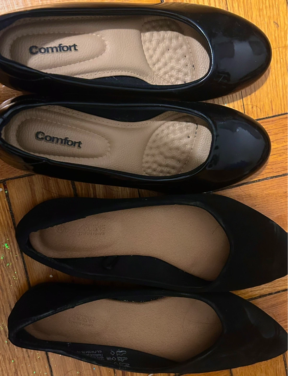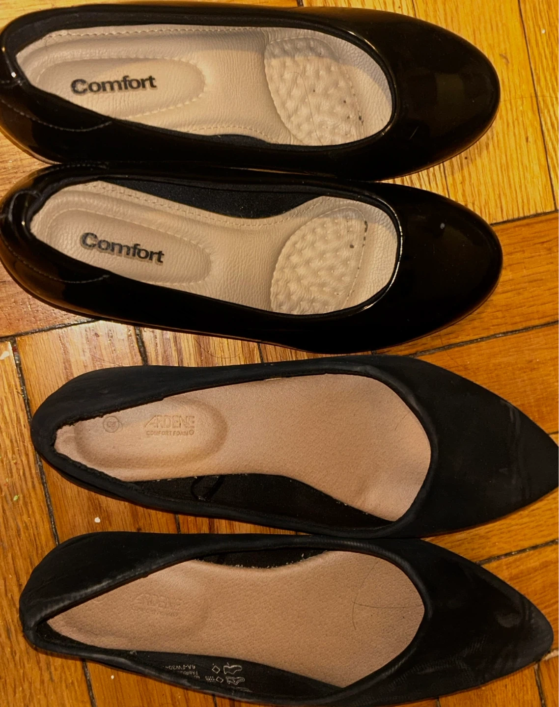 Two pairs of black ballet flats. One pair is shiny patent leather from Comfort. The other pair is soft black suede from Ardene. These are comfy and stylish shoes.