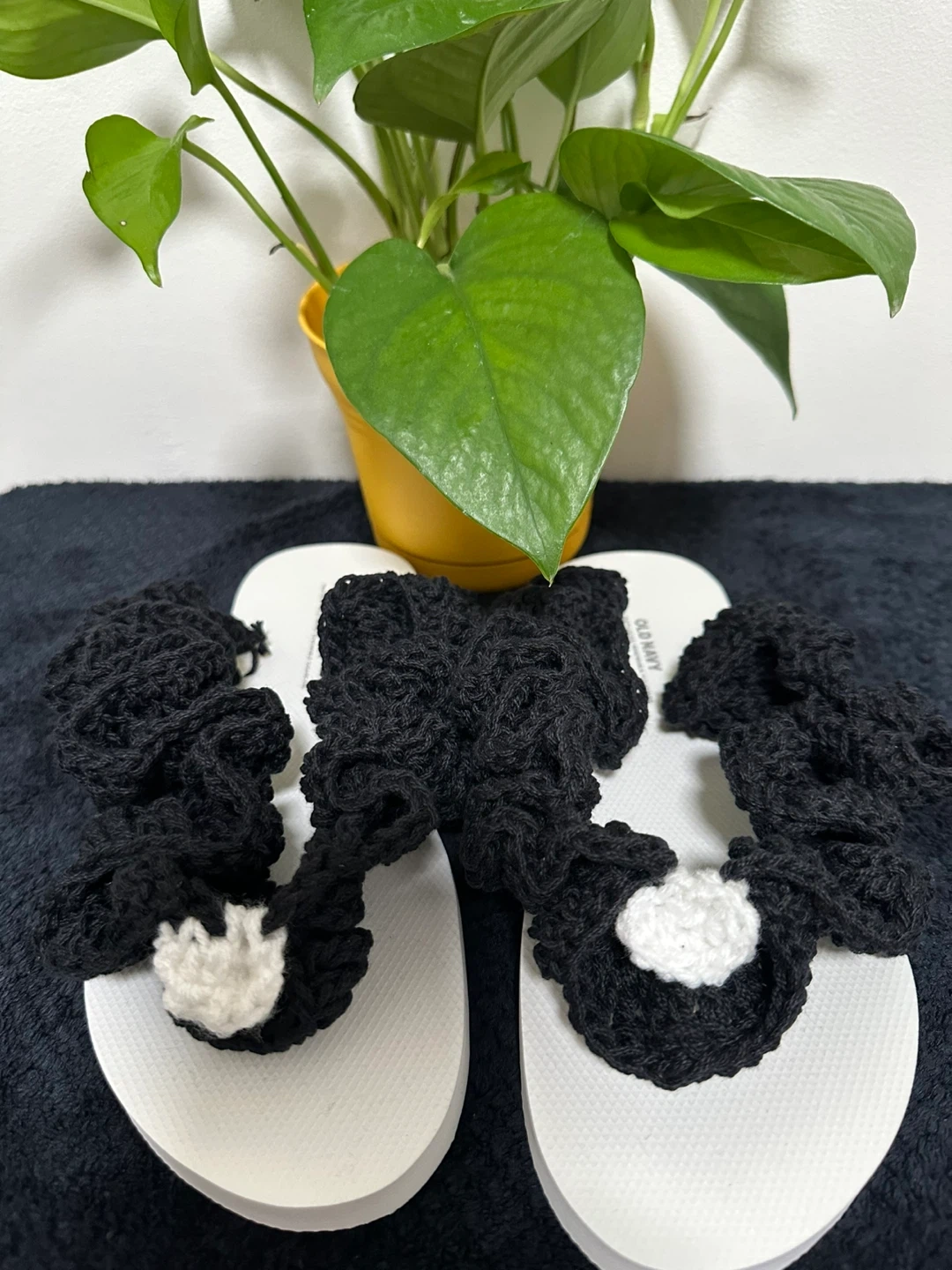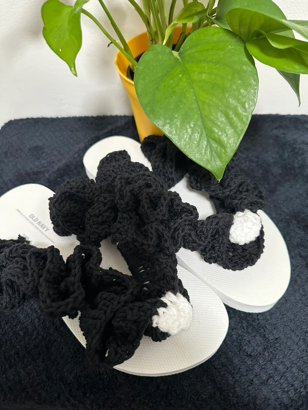 Cute pair of Old Navy flip flops! They're white with black crochet embellishments and a white pompom detail. Perfect for summer!