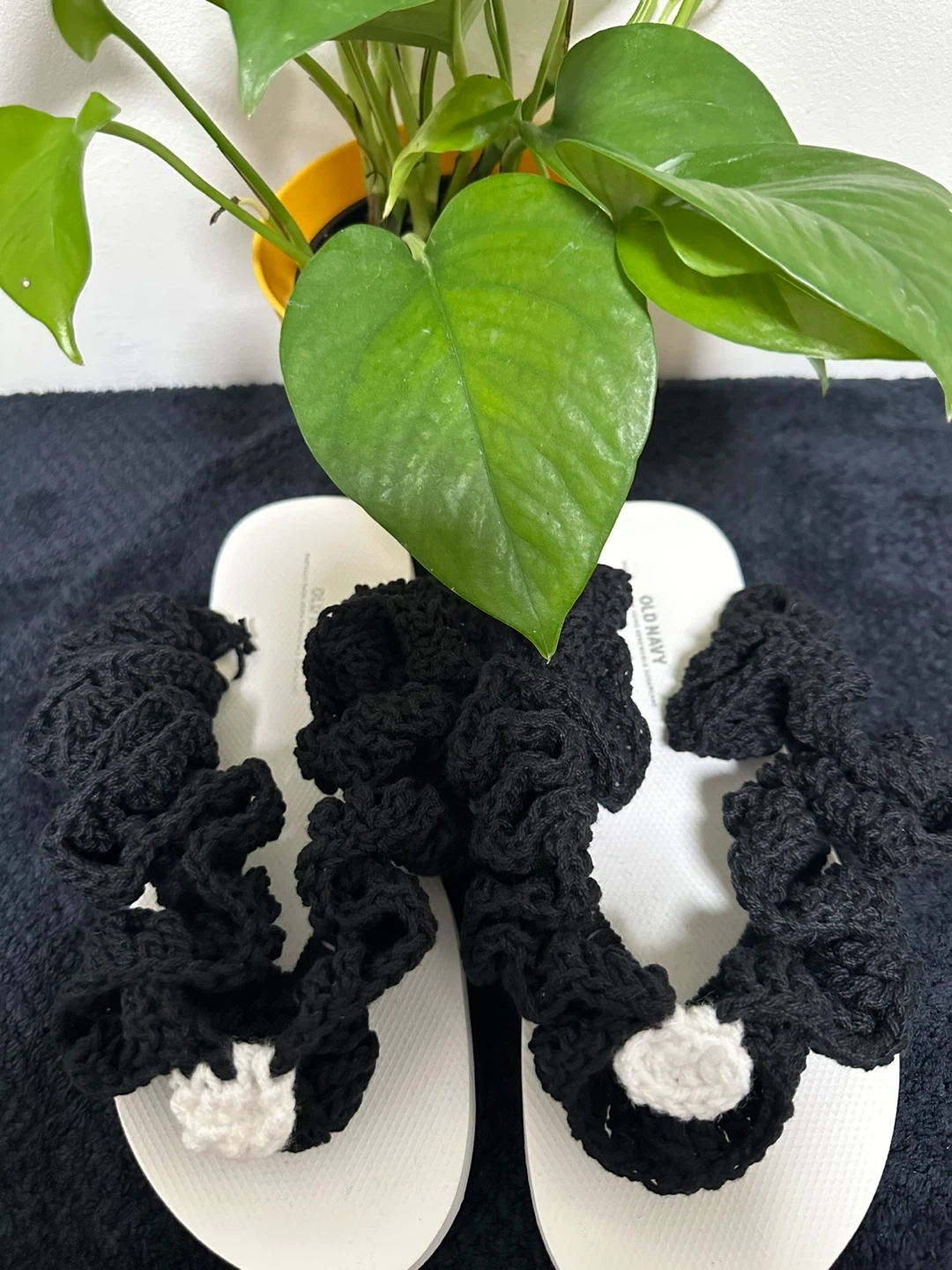 Cute pair of Old Navy flip flops! They're white with black crochet embellishments and a white pompom detail. Perfect for summer!