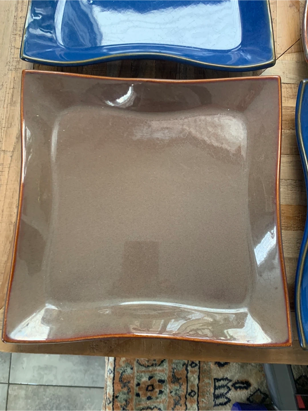 These four square plates come in a mix of blue and brown colours. They feature a unique wavy edge design. Great for serving meals.