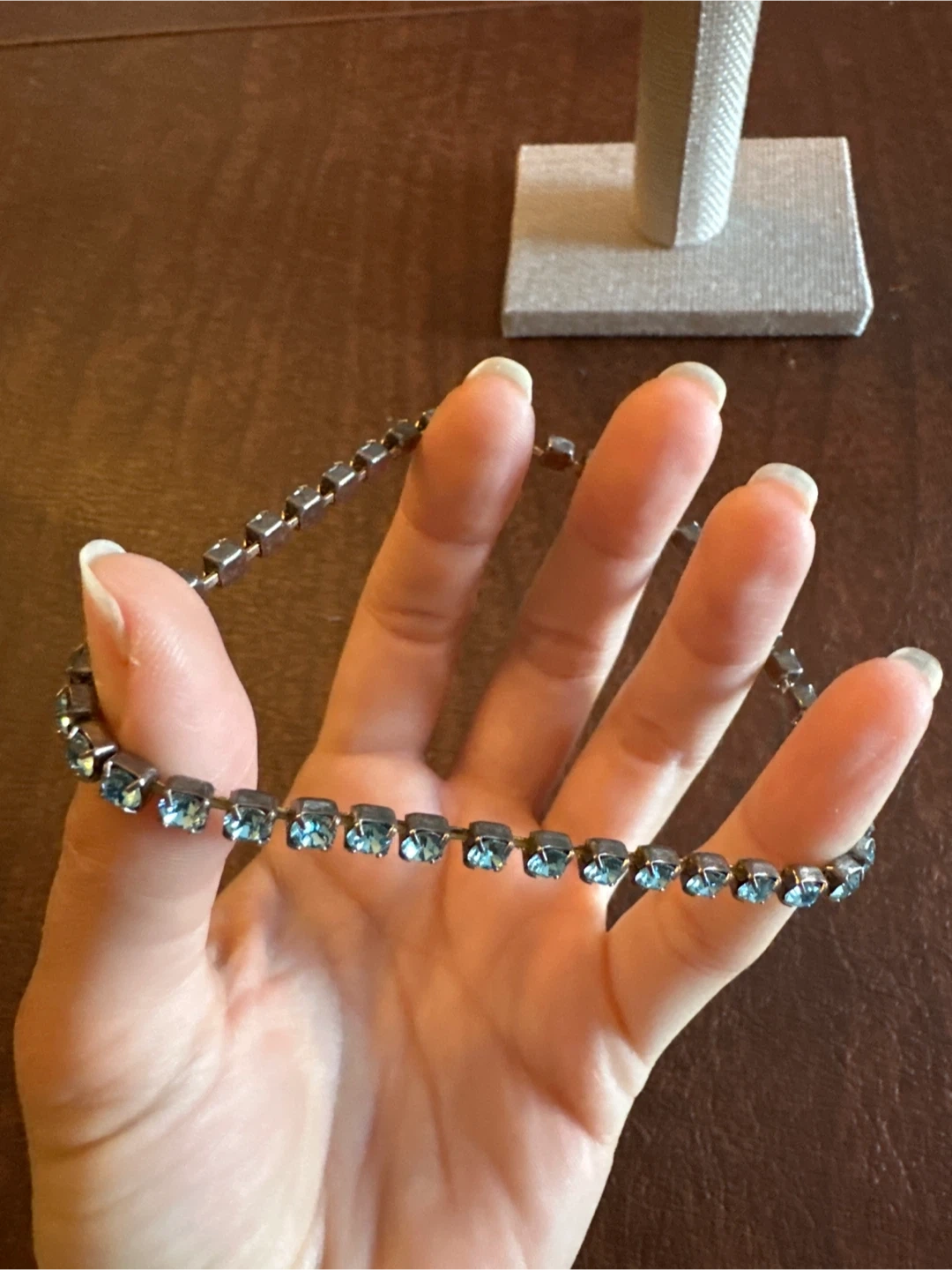 This is a lovely bracelet featuring light blue rhinestones set in a silver-toned metal chain. It's a simple and elegant piece. This bracelet would be great for adding a bit of sparkle to any outfit!