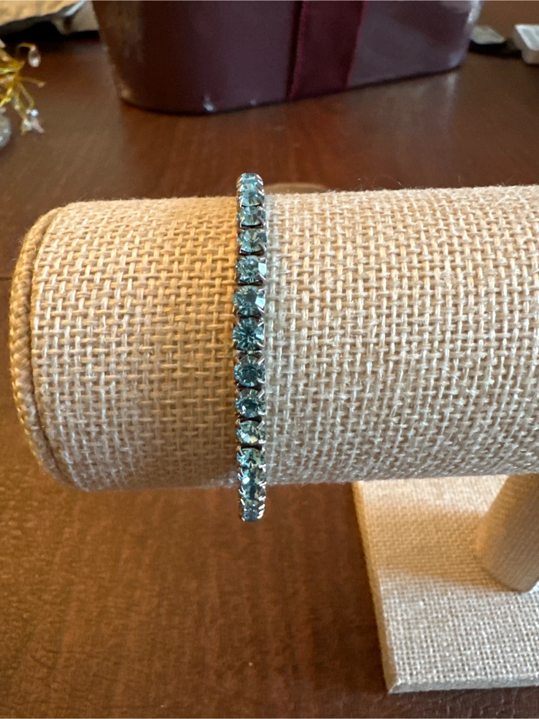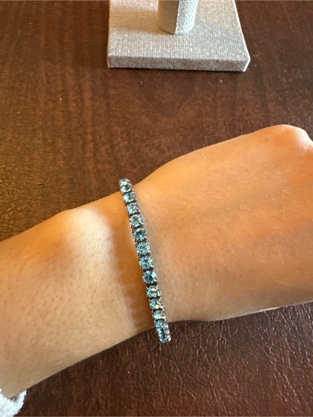 This is a lovely bracelet featuring light blue rhinestones set in a silver-toned metal chain. It's a simple and elegant piece. This bracelet would be great for adding a bit of sparkle to any outfit!