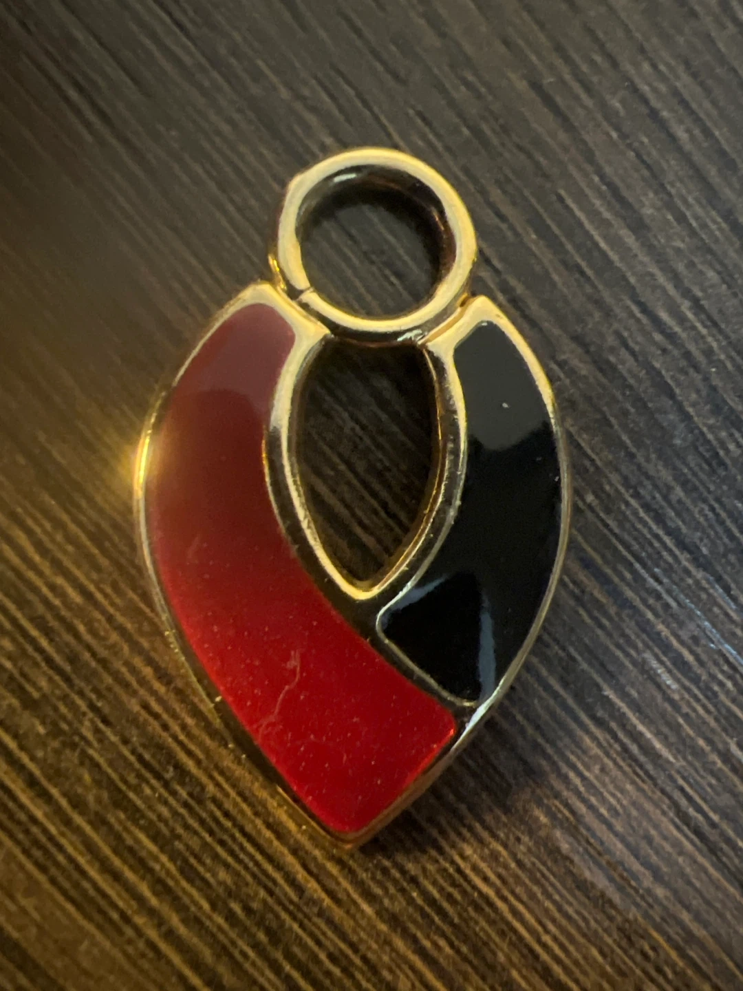 This is a vintage Monet pendant with a gold tone and red and black enamel accents. It's in great condition and ready to add a touch of retro style to your wardrobe!