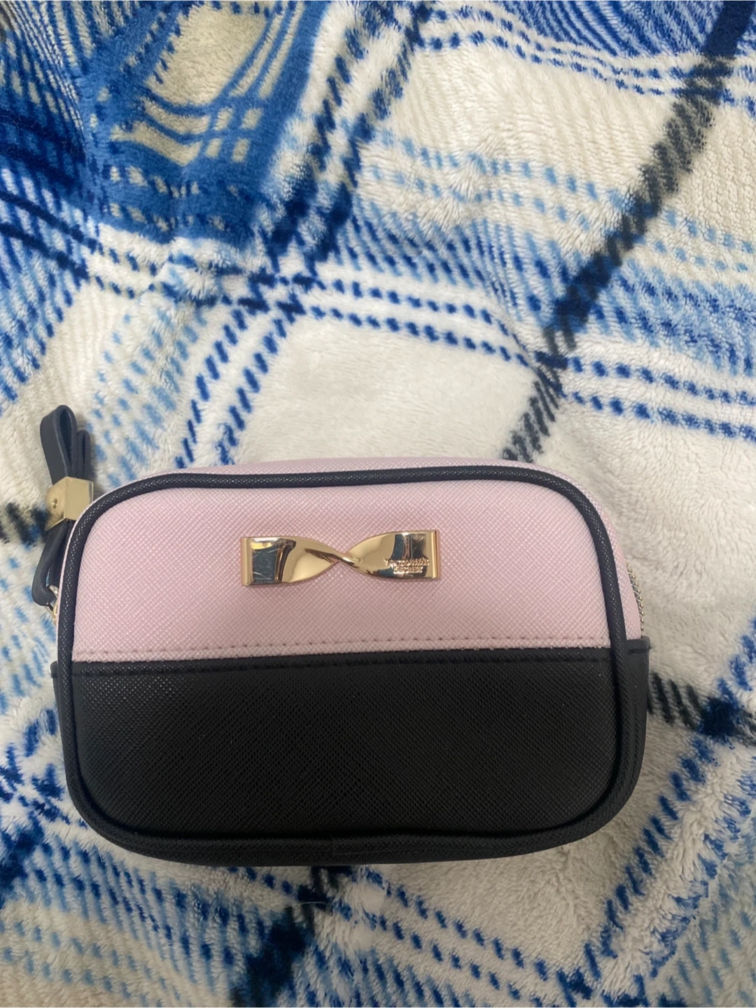 It's a cute pink and black cosmetic bag from Victoria's Secret. It features a gold bow detail. Saffiano leather material. Pick up cash only