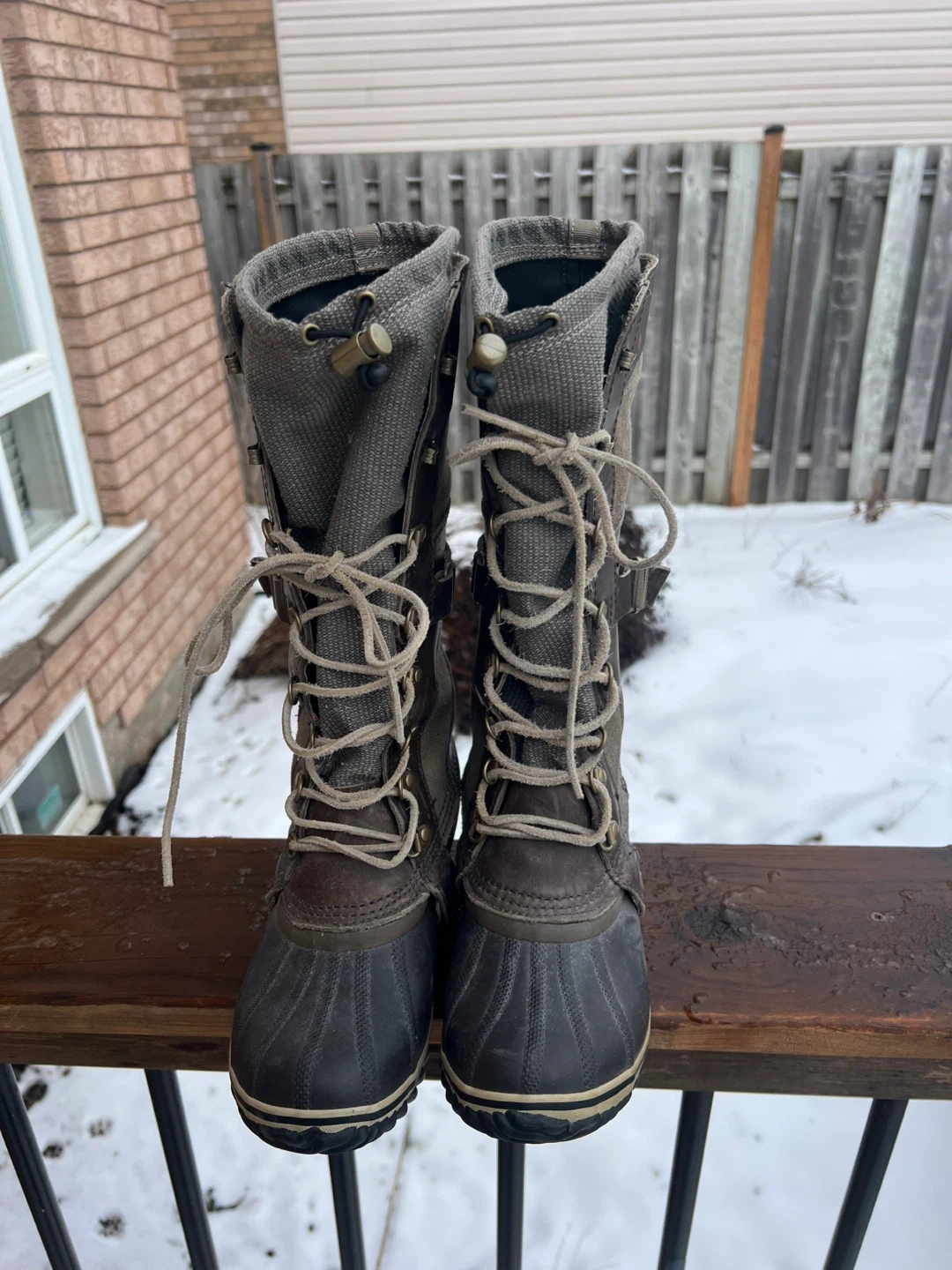 These Sorel boots are built for winter weather. They feature a lace-up front and a rubber sole for traction.They're great for keeping your feet warm and dry during snowstorms!