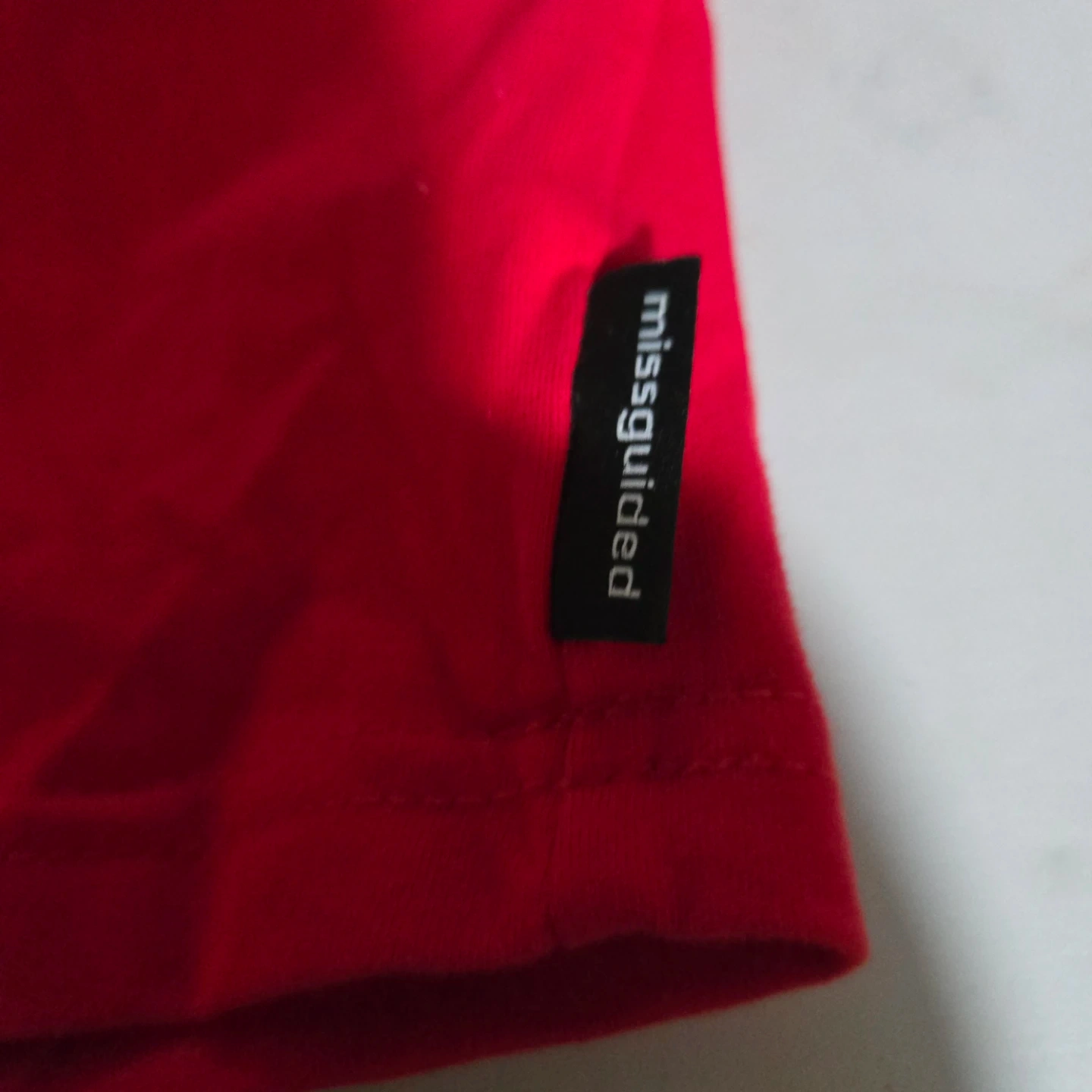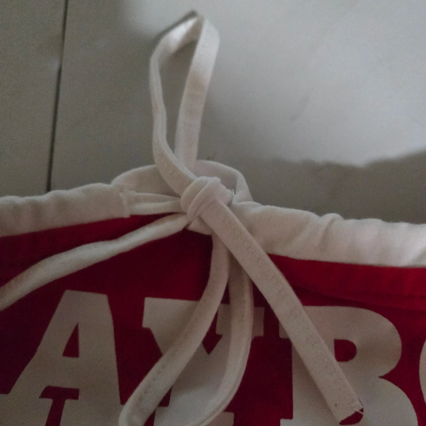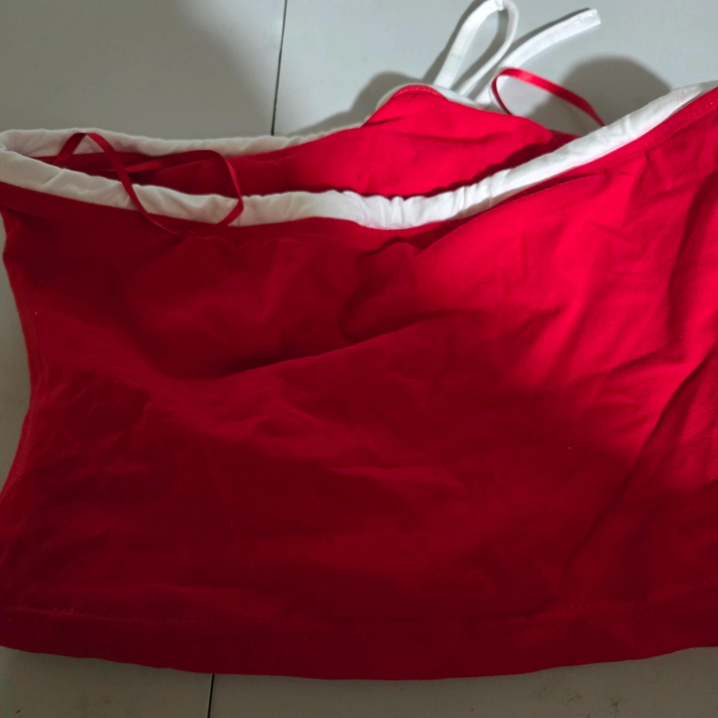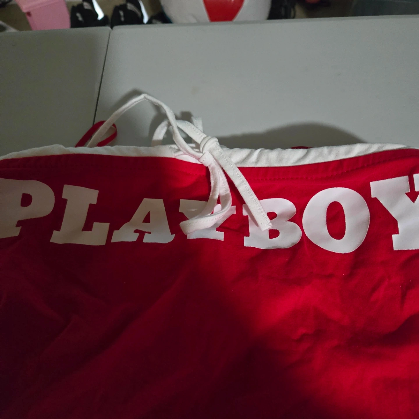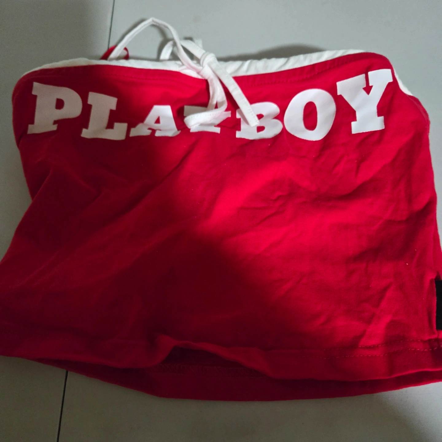 This is a red Playboy tube top with white lettering. It has adjustable ties at the top. Material is cotton blend.