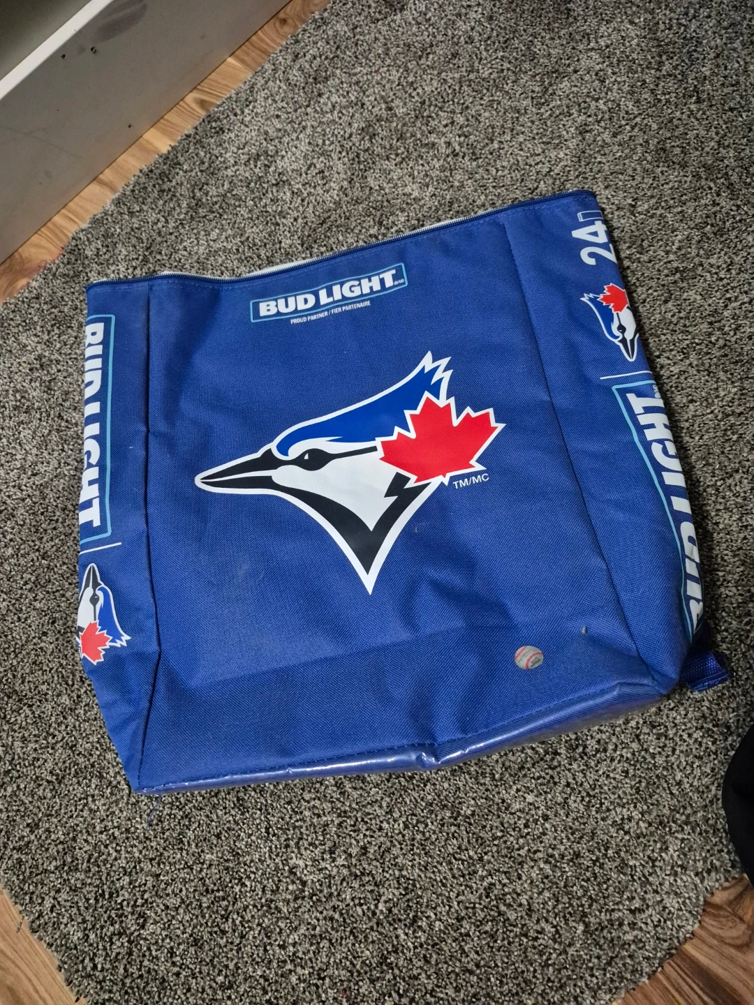 This Bud Light cooler bag features the Toronto Blue Jays logo. It's a great way to keep drinks and snacks cool. It's made of durable blue material with zippers.