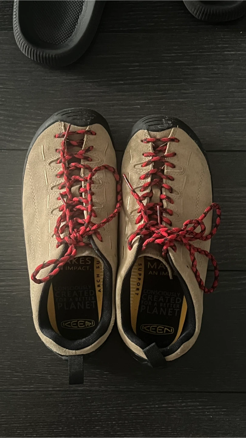 KEEN Jasper shoes with red laces. Consciously created for a better planet. Suede material with arch support. Perfect for outdoor adventures!