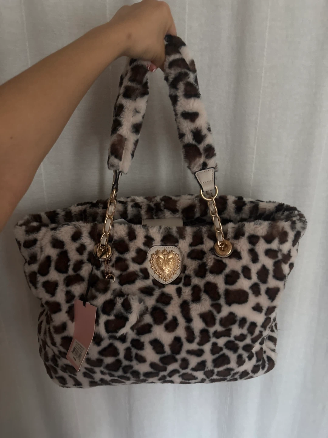 Check out this super cute Juicy Couture tote bag! It features a fun leopard print design in faux fur. It's perfect for adding a touch of style to any outfit.