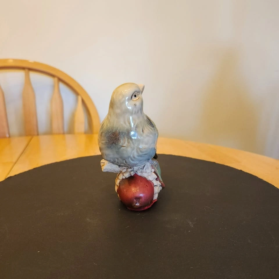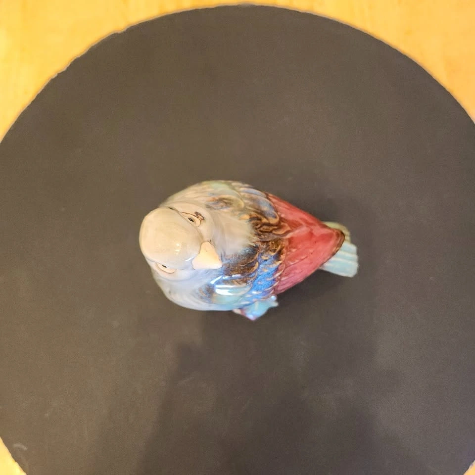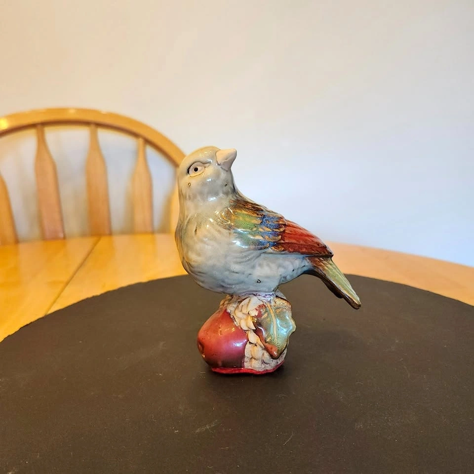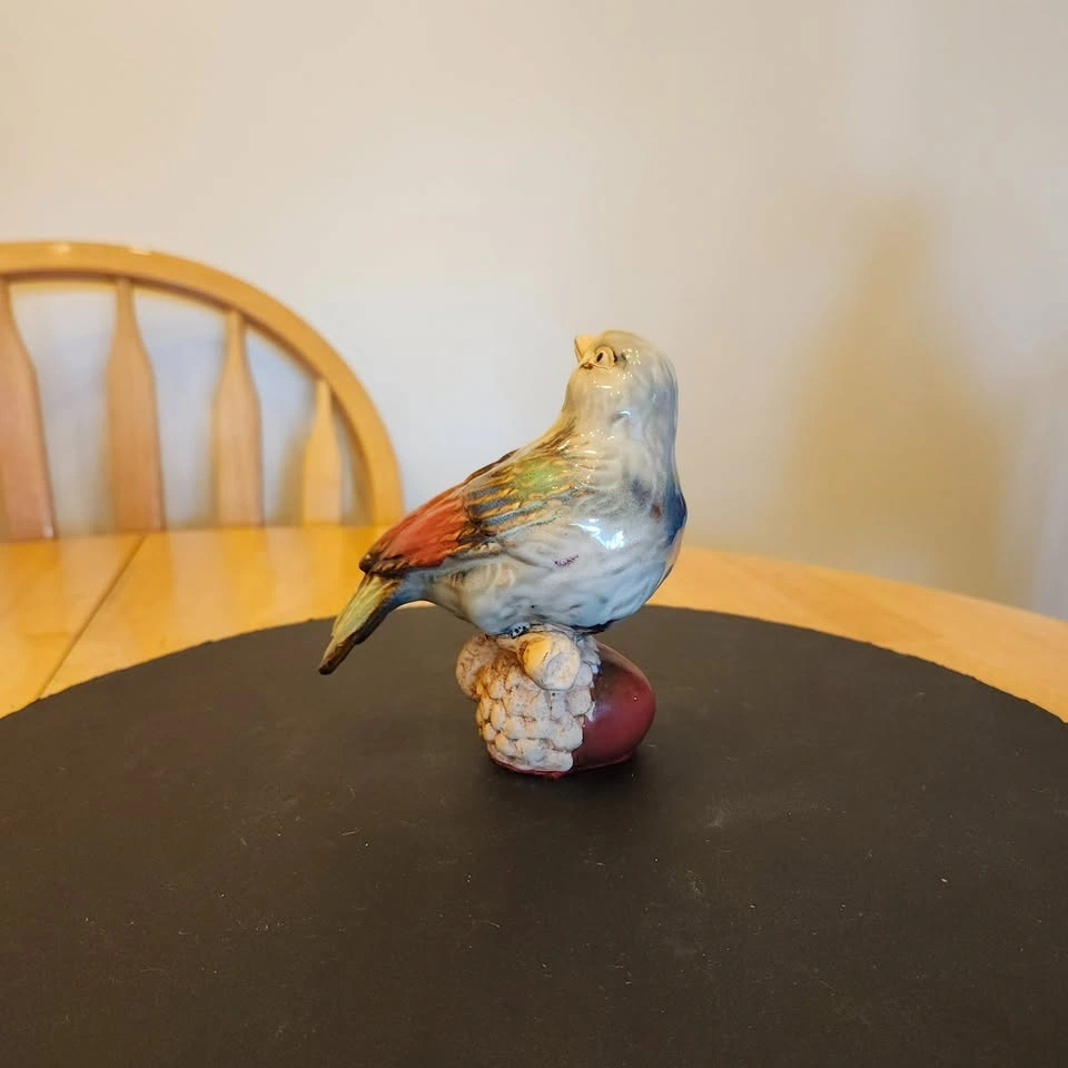 Brightly colored with greens, blue and red accents, this ceramic bird perched on an acorn will be a great addition to your home decor.