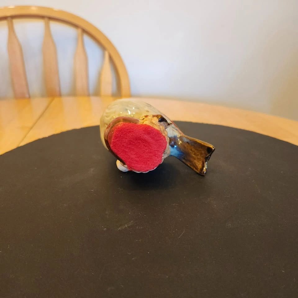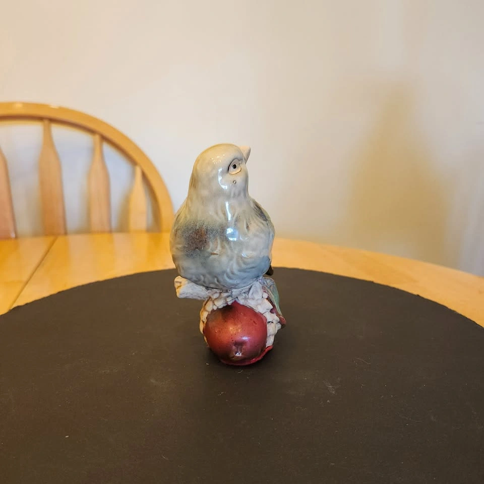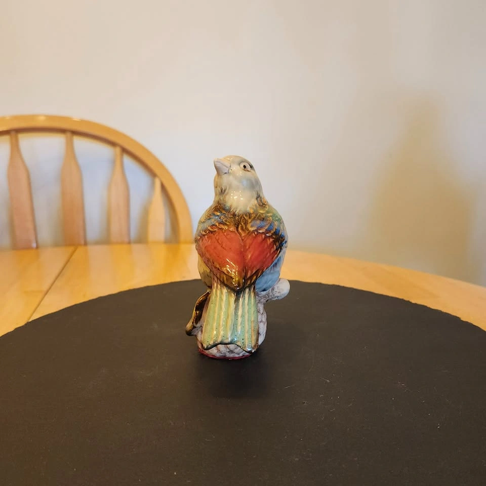 Brightly colored with greens, blue and red accents, this ceramic bird perched on an acorn will be a great addition to your home decor.