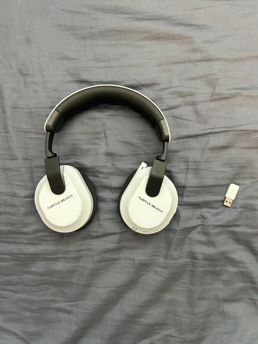 Turtle Beach wireless gaming headset in white. It's a headset and includes the USB dongle for wireless connectivity. Good for gaming!
