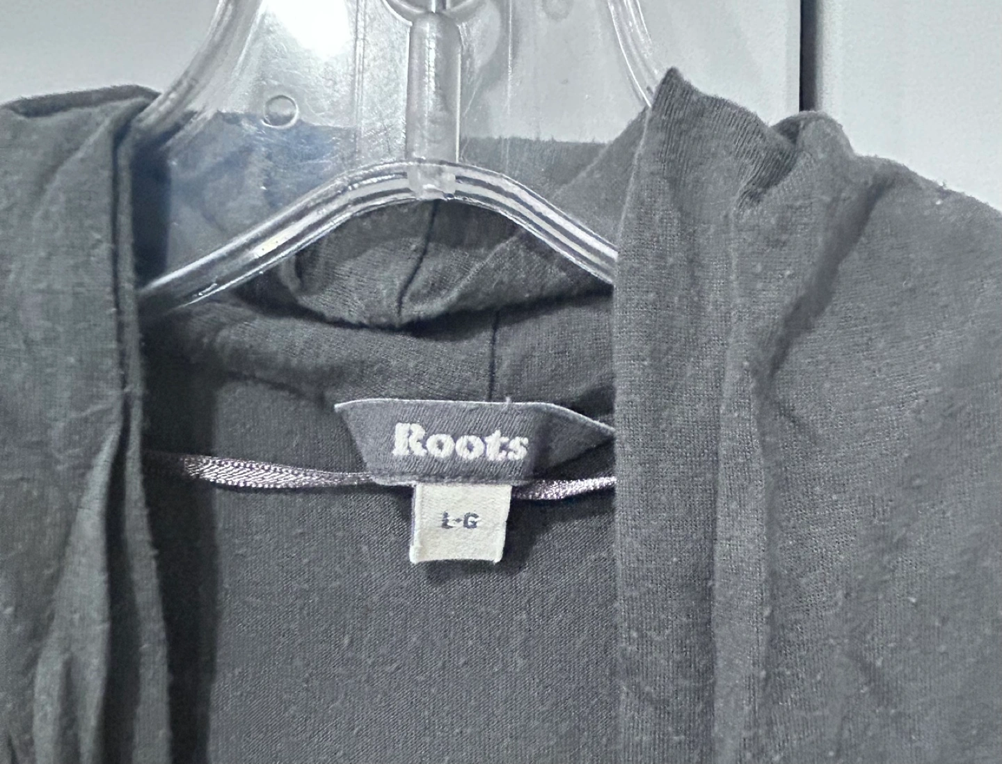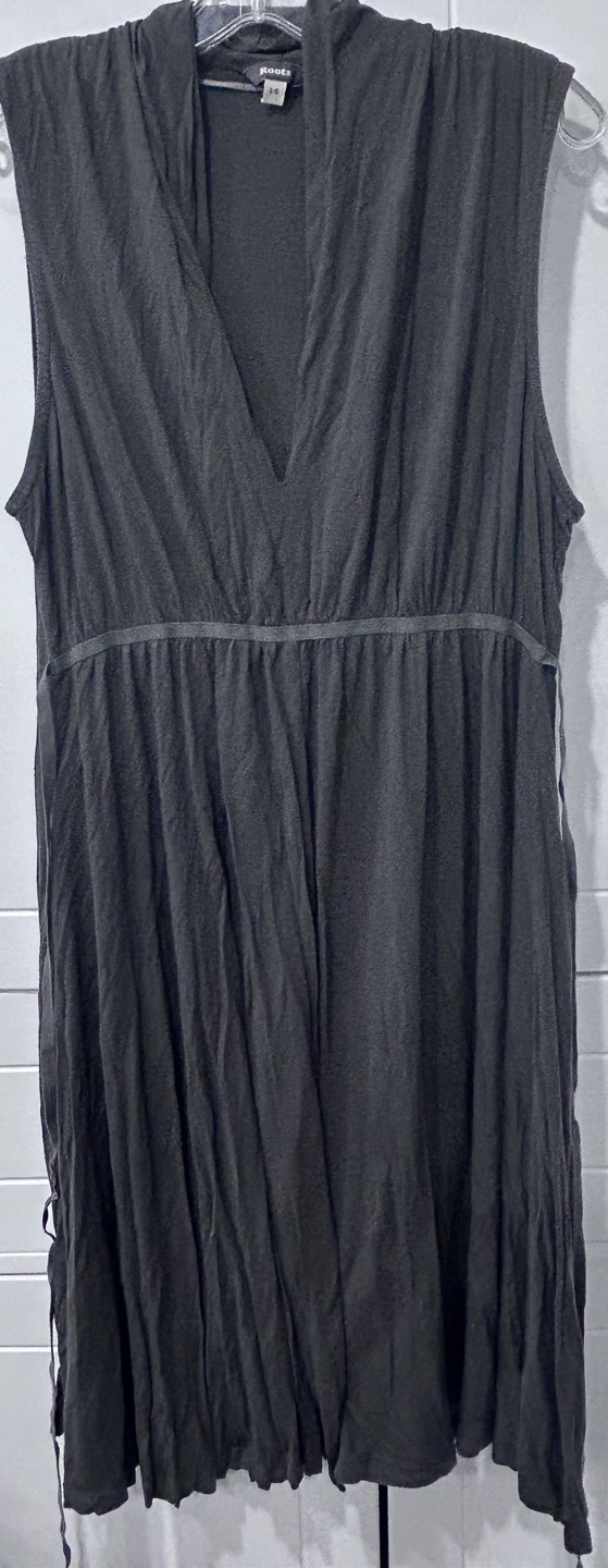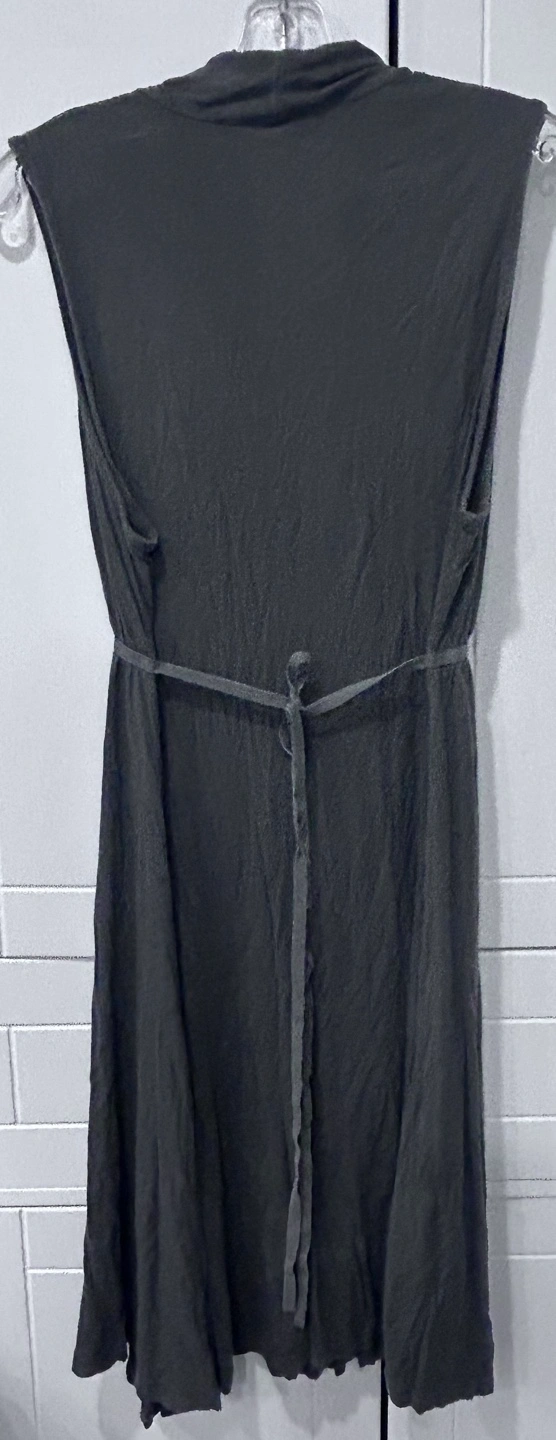 Sleeveless grey dress with a v-neck, tie at the waist. Size L-G.