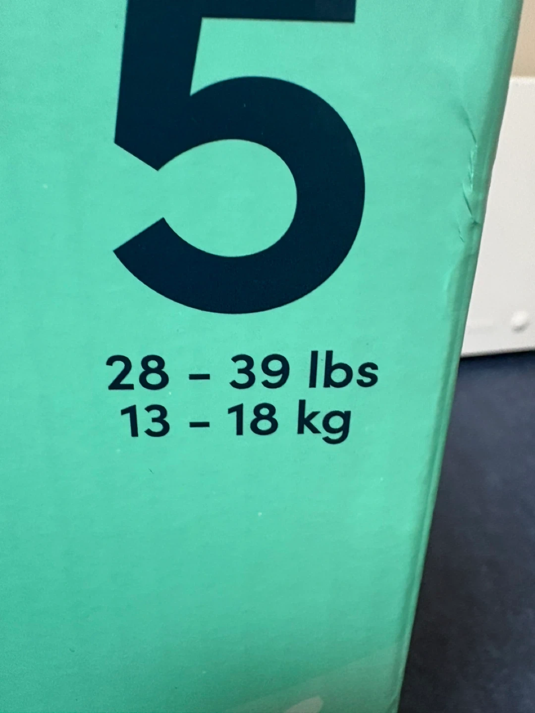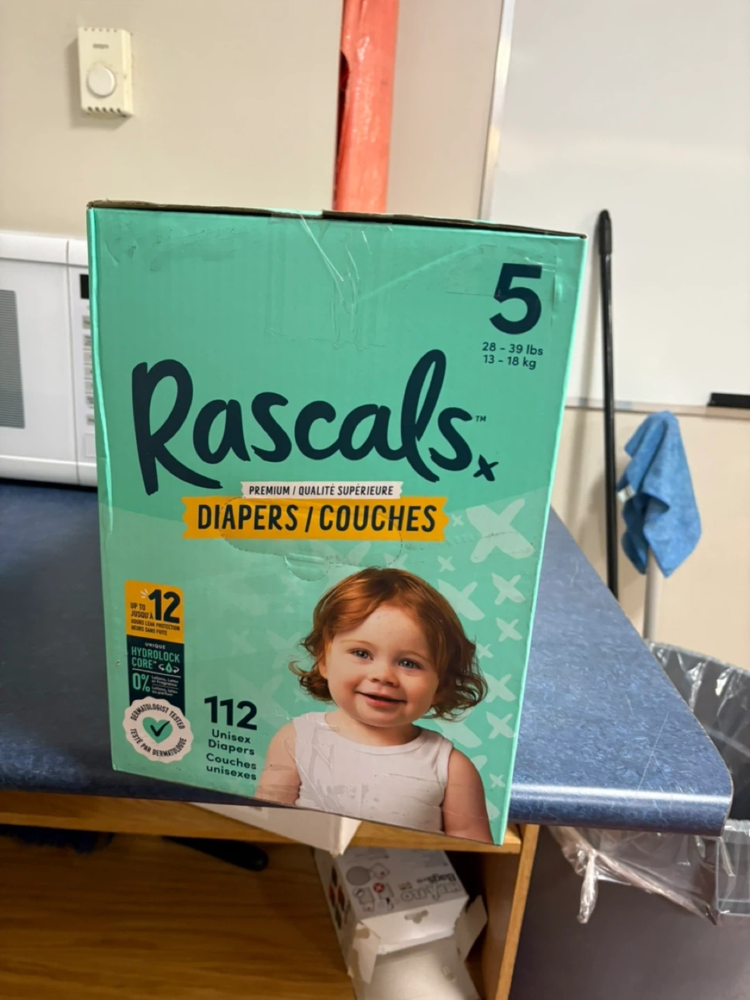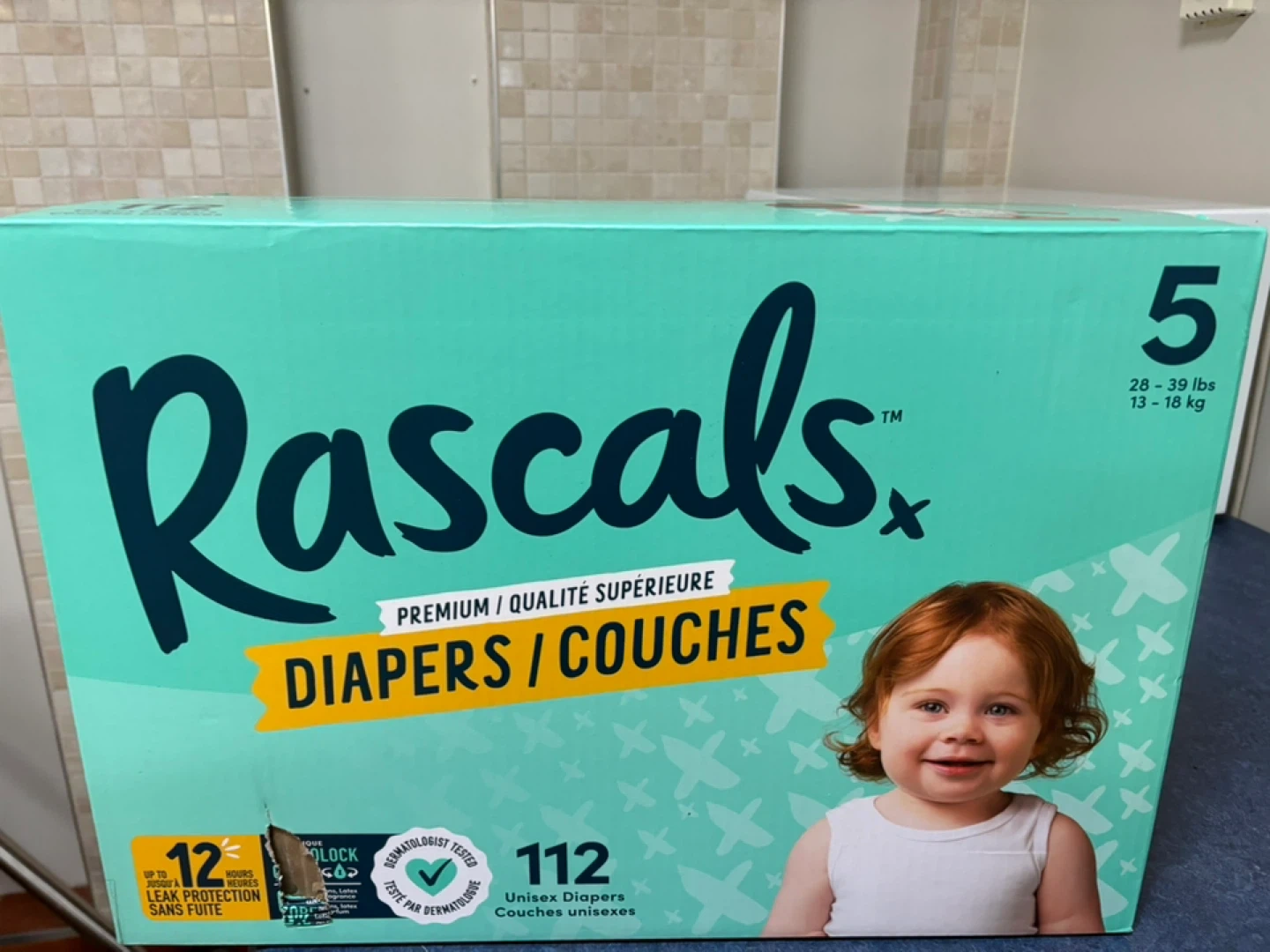 Rascals Premium Quality Superior Diapers in size 5. Box contains 112 unisex diapers. Suitable for babies weighing 28-39 lbs (13-18 kg). Features 12-hour leak protection.