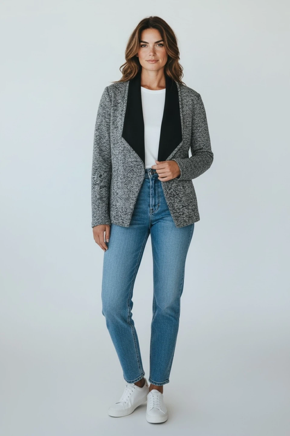 Selling a stylish grey textured blazer featuring a sleek black lapel. This blazer is perfect for adding a touch of sophistication to any outfit. It's in great condition and ready for a new wardrobe!