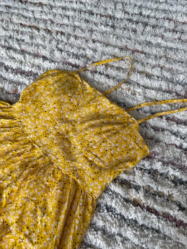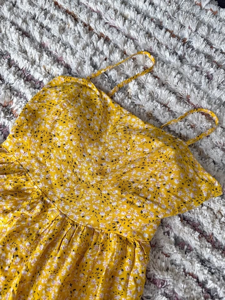 Very cute summer dress, brighter yellow in person. Features an open back and built-in chest padding, so no bra is needed. The back is adjustable with ties, so it could fit up to a Medium. Meet near Union Station.