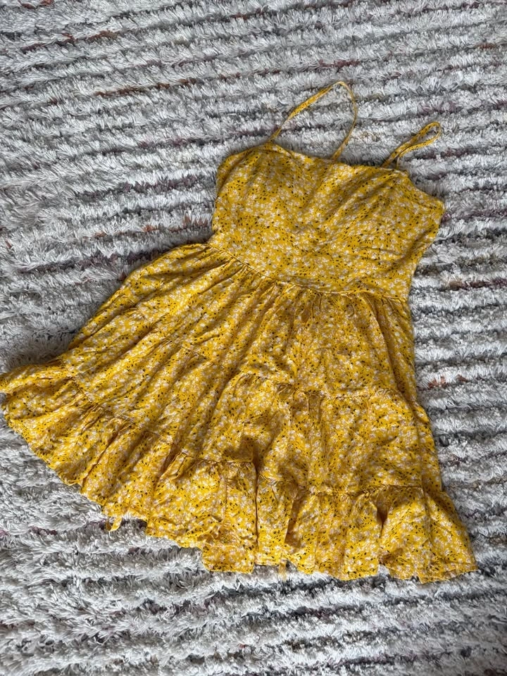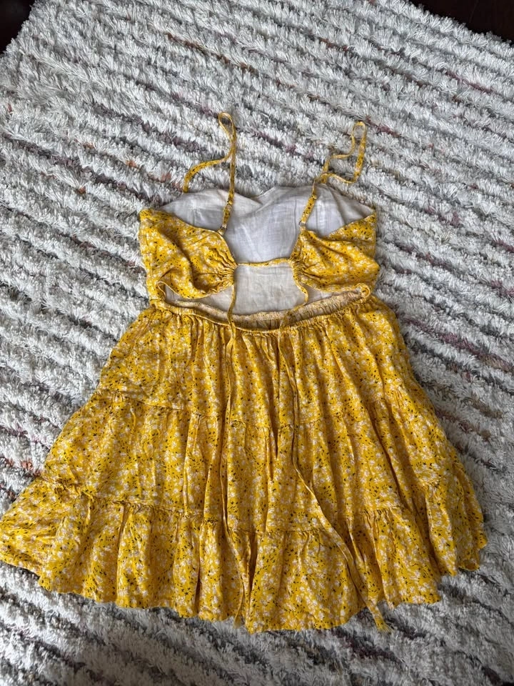 Very cute summer dress, brighter yellow in person. Features an open back and built-in chest padding, so no bra is needed. The back is adjustable with ties, so it could fit up to a Medium. Meet near Union Station.